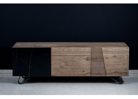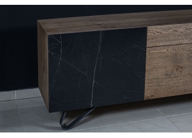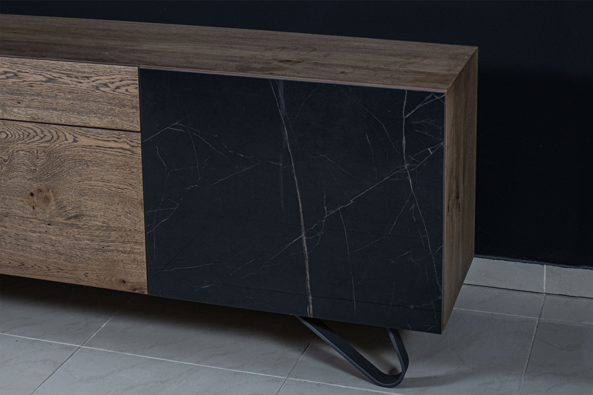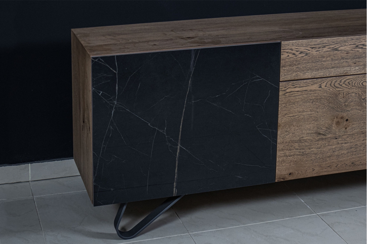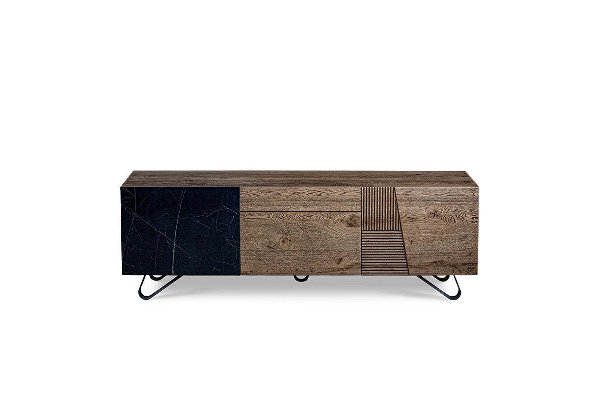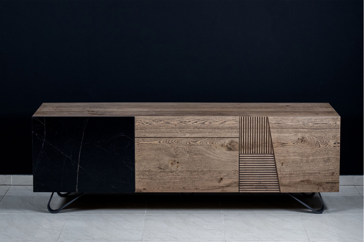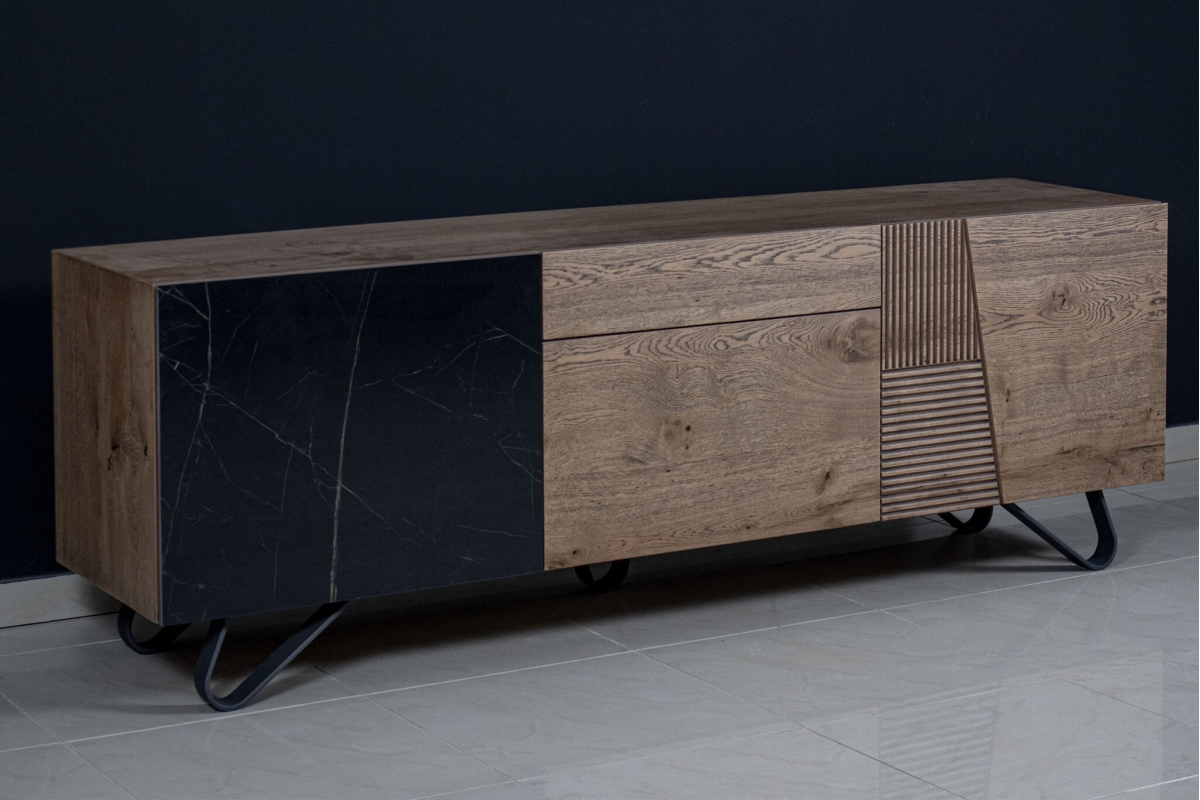Ένας μπουφές που εντυπωσιάζει με τον ξεχωριστό σχεδιασμό, τον συνδυασμό διαφορετικών, ποιοτικών υλικών και τη δυνατότητα για άφθονο αποθηκευτικό χώρο. Στο design του κυριαρχούν τα γεωμετρικά σχέδια, διαθέτει κεραμική πόρτα, συρτάρι και μεταλλικά πόδια.