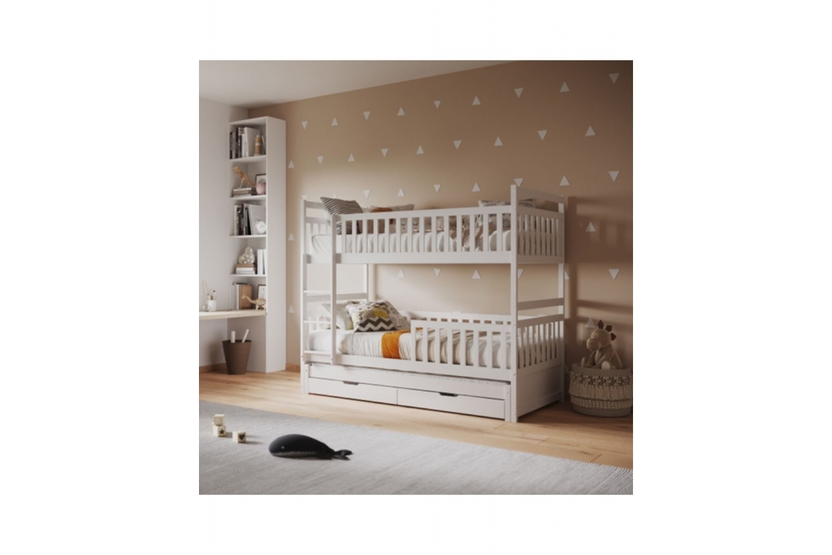 Το παιδικό κρεβάτι-κουκέτα TRIPLON είναι σχεδιασμένο για μονά στρώματα διαστάσεων 90x190 και 200 εκ. Αποτελεί μια εξαιρετική, μοντέρνα και ασφαλή επιλογή για το παιδικό δωμάτιο. Είναι κατασκευασμένο από ξύλο σε λευκό χρώμα, βαμμένο με μη τοξικό, υδατοδιαλυτό βερνίκι, ιδανικό για παιδιά. Τα στρώματα τοποθετούνται σε τάβλες από κόντρα πλακέ. Η πρόσβαση στο επάνω κρεβάτι γίνεται μέσω μιας πρακτικής κάθετης σκάλας, ενώ και τα δύο κρεβάτια διαθέτουν περιμετρικά κάγκελα για επιπλέον ασφάλεια. Μια ξεχωριστή δυνατότητα της κουκέτας είναι το συρόμενο κρεβάτι που τοποθετείται στο κάτω μέρος, καθώς και τα δύο συρτάρια που προσφέρουν επιπλέον αποθηκευτικό χώρο. Είναι η ιδανική λύση για σπίτια με περιορισμένο χώρο