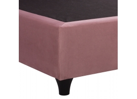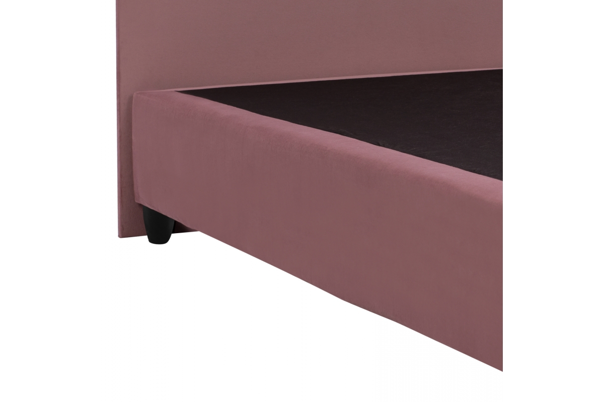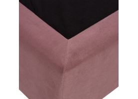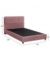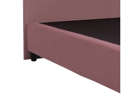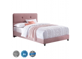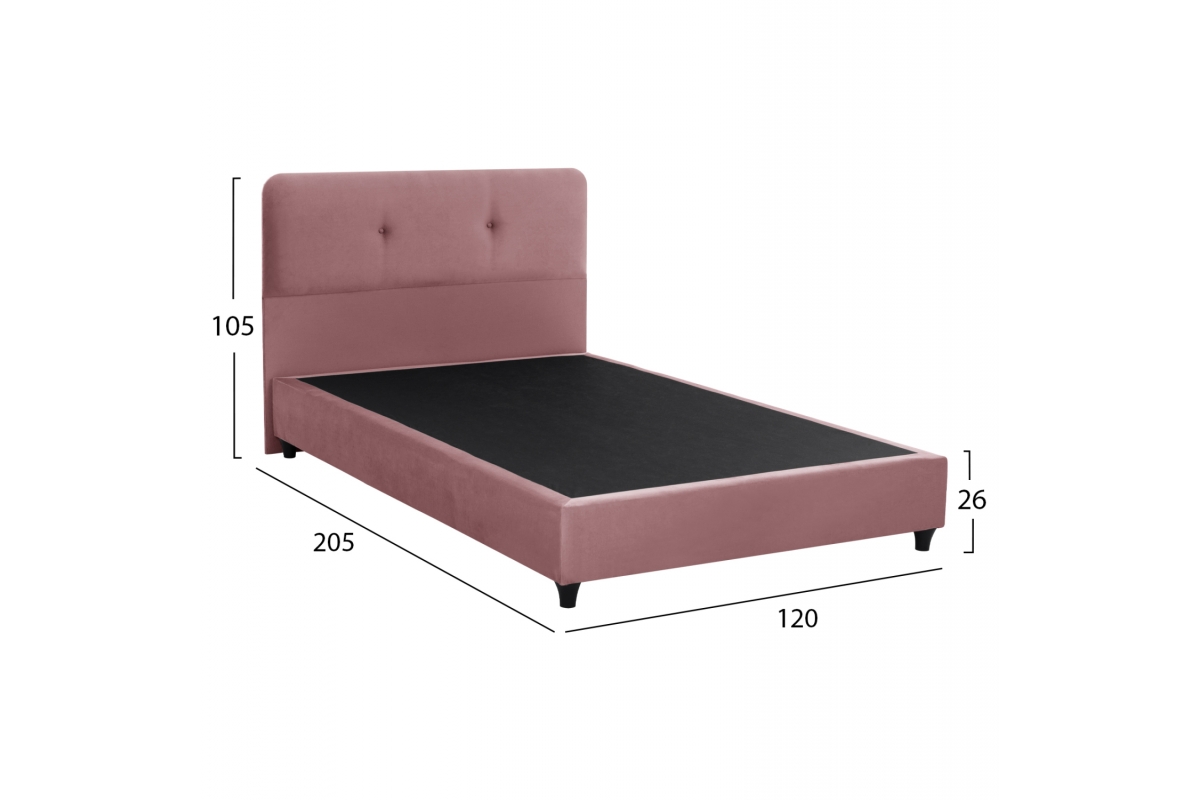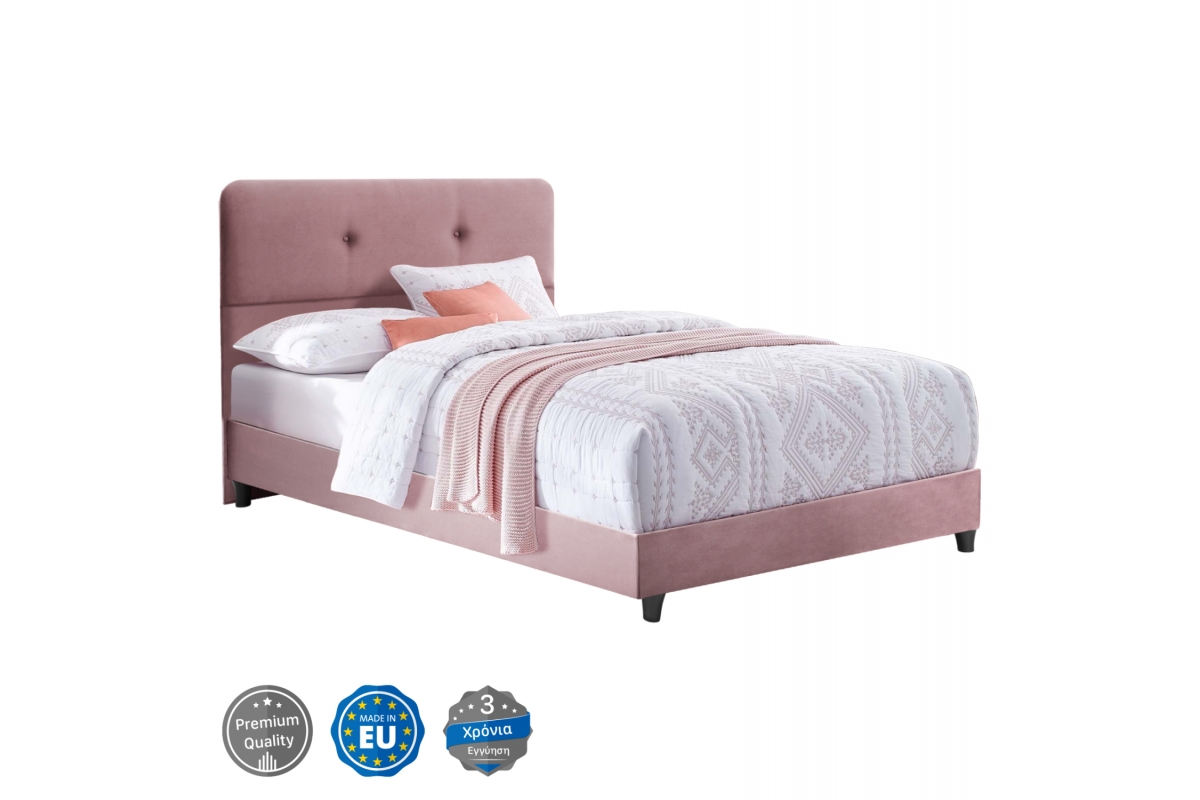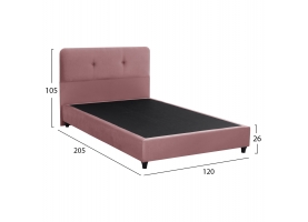 Το κεφαλάρι είναι ψηλό και διακοσμημένο με δύο τρουκς (κουμπάκια), ενώ η επένδυση του κρεβατιού είναι από εξαιρετικό βελούδινο ύφασμα που καθαρίζει πολύ εύκολα. Το χρώμα DUSTY PINK ή ΠΕΤΡΟΛ που καλύπτει ολόκληρο το κρεβάτι είναι ουδέτερο και μπορεί να συνδυαστεί με ποικιλία διακοσμητικών μοτίβων. Το ιδιαίτερο χαρακτηριστικό αυτού του κρεβατιού είναι ότι δεν διαθέτει την παραδοσιακή κατασκευή με τάβλες σουμιέ για την υποστήριξη του στρώματος, αλλά αποτελείται από μια ενιαία επιφάνεια στην οποία τοποθετείται το στρώμα. Οι διαστάσεις του στρώματος είναι 120x200 εκ.