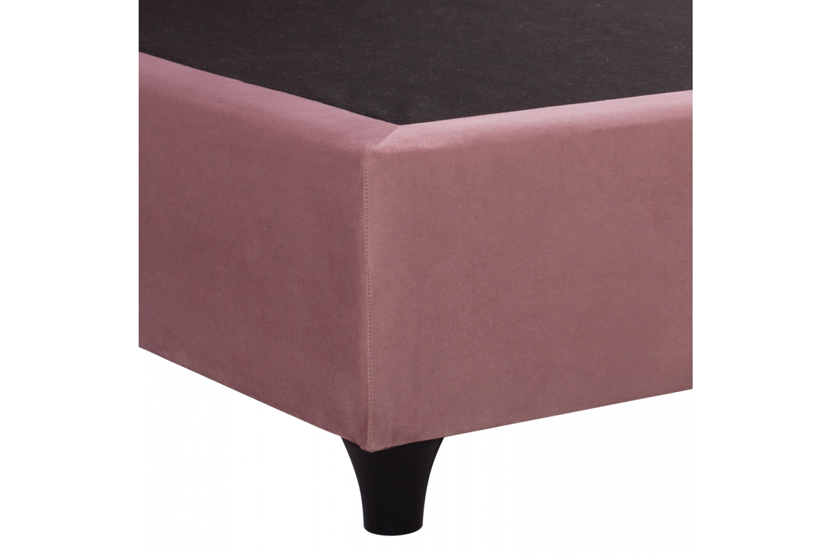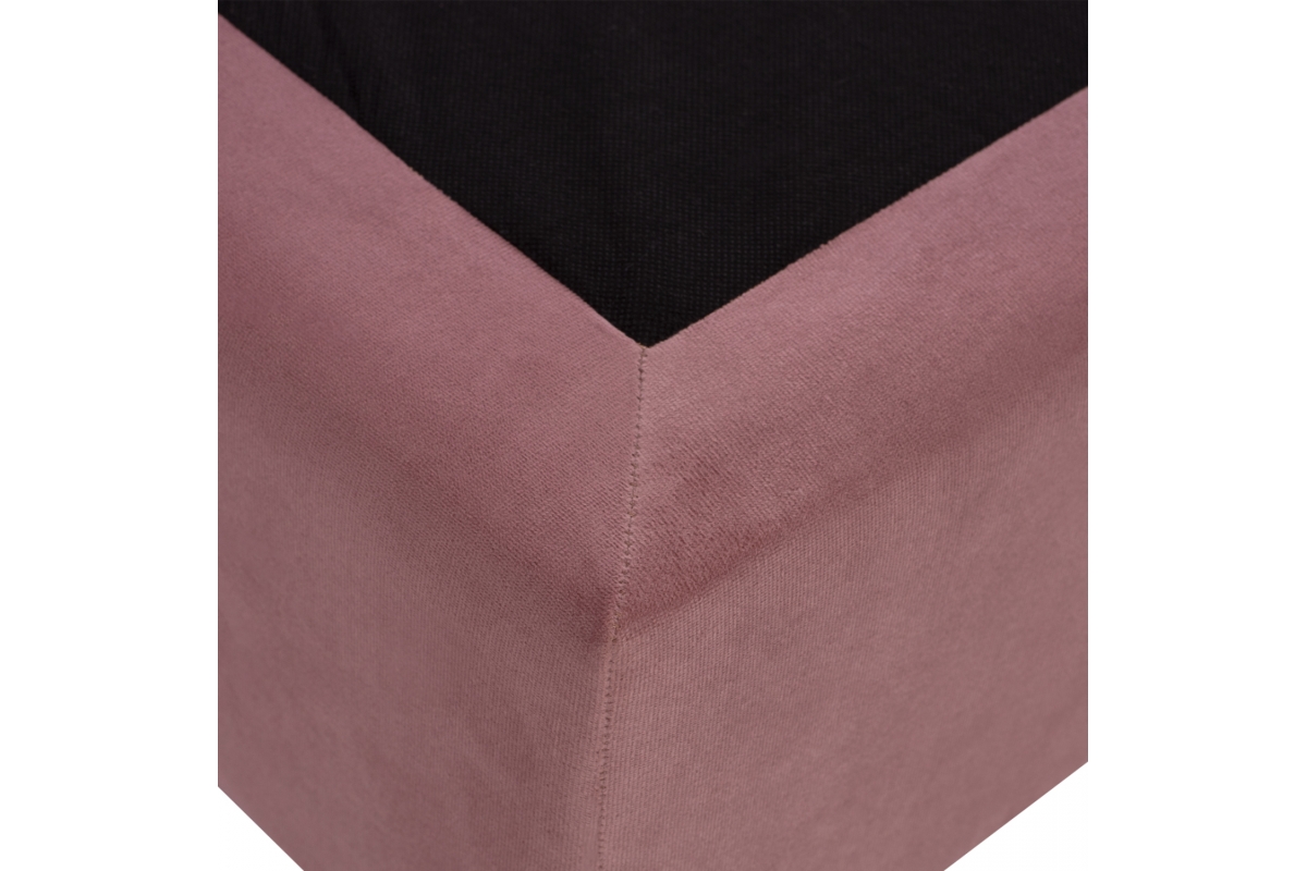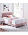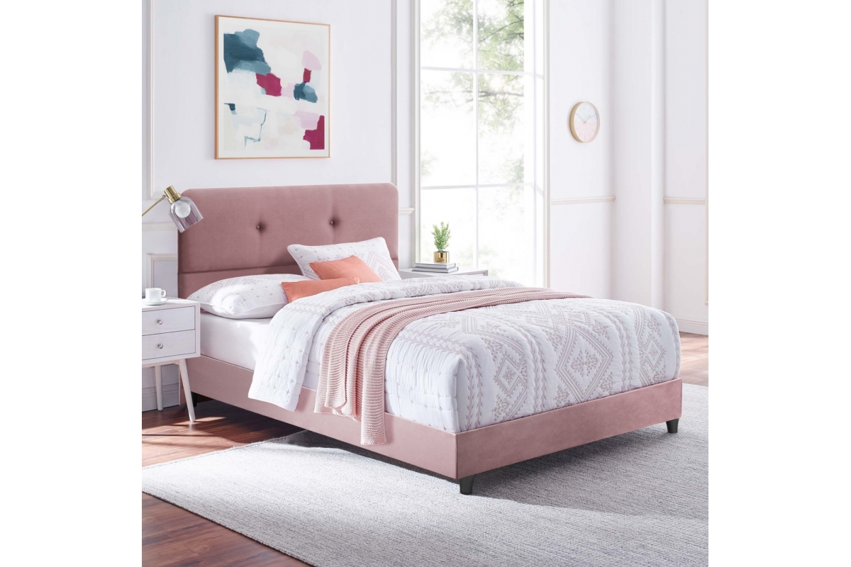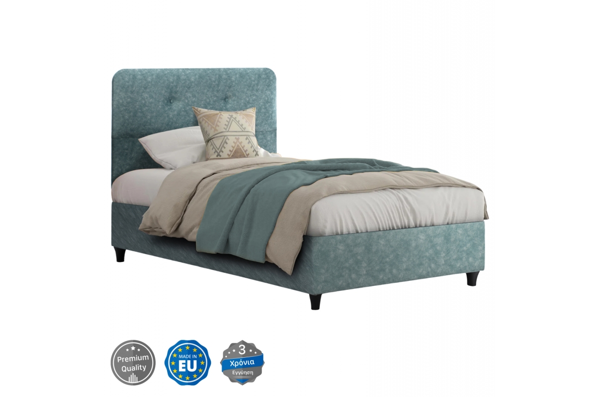 Το κεφαλάρι είναι ψηλό και διακοσμημένο με δύο τρουκς (κουμπάκια), ενώ η επένδυση του κρεβατιού είναι από εξαιρετικό βελούδινο ύφασμα που καθαρίζει πολύ εύκολα. Το χρώμα DUSTY PINK ή ΠΕΤΡΟΛ που καλύπτει ολόκληρο το κρεβάτι είναι ουδέτερο και μπορεί να συνδυαστεί με ποικιλία διακοσμητικών μοτίβων. Το ιδιαίτερο χαρακτηριστικό αυτού του κρεβατιού είναι ότι δεν διαθέτει την παραδοσιακή κατασκευή με τάβλες σουμιέ για την υποστήριξη του στρώματος, αλλά αποτελείται από μια ενιαία επιφάνεια στην οποία τοποθετείται το στρώμα. Οι διαστάσεις του στρώματος είναι 120x200 εκ.