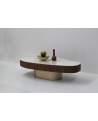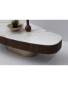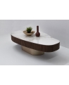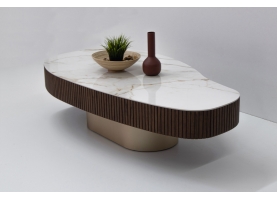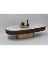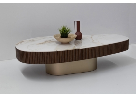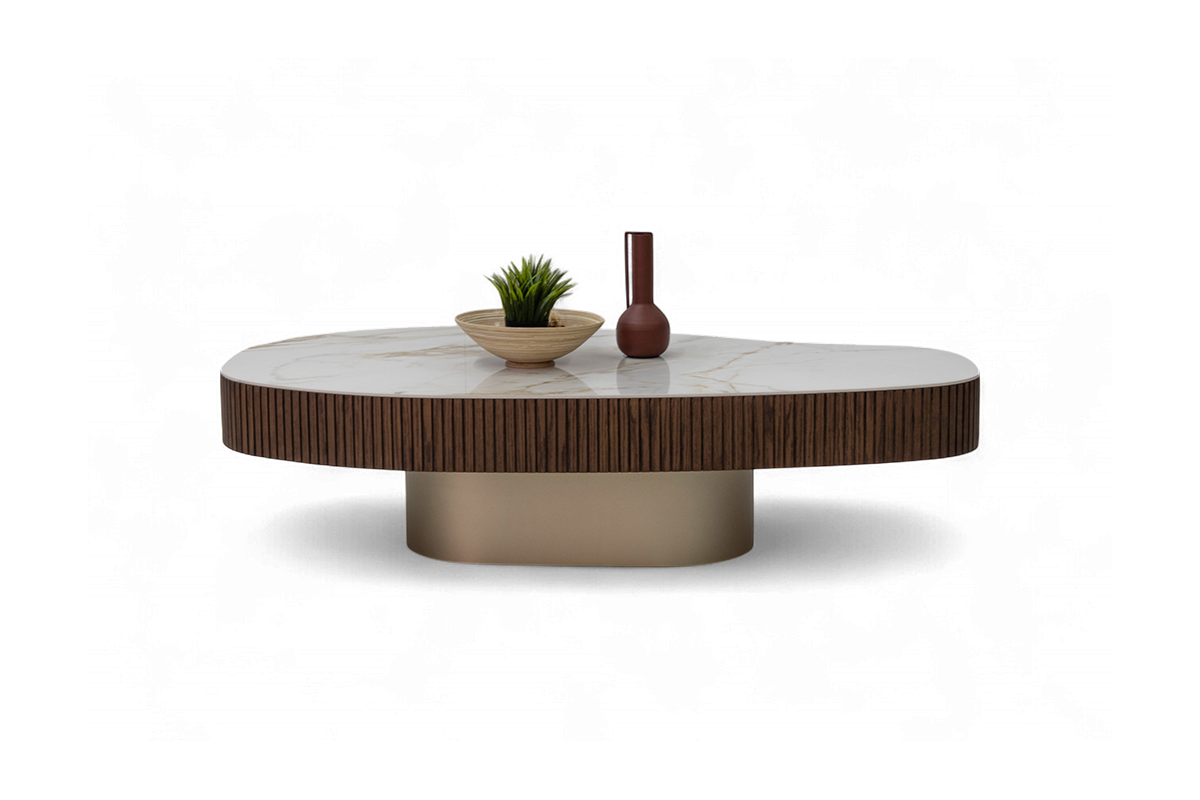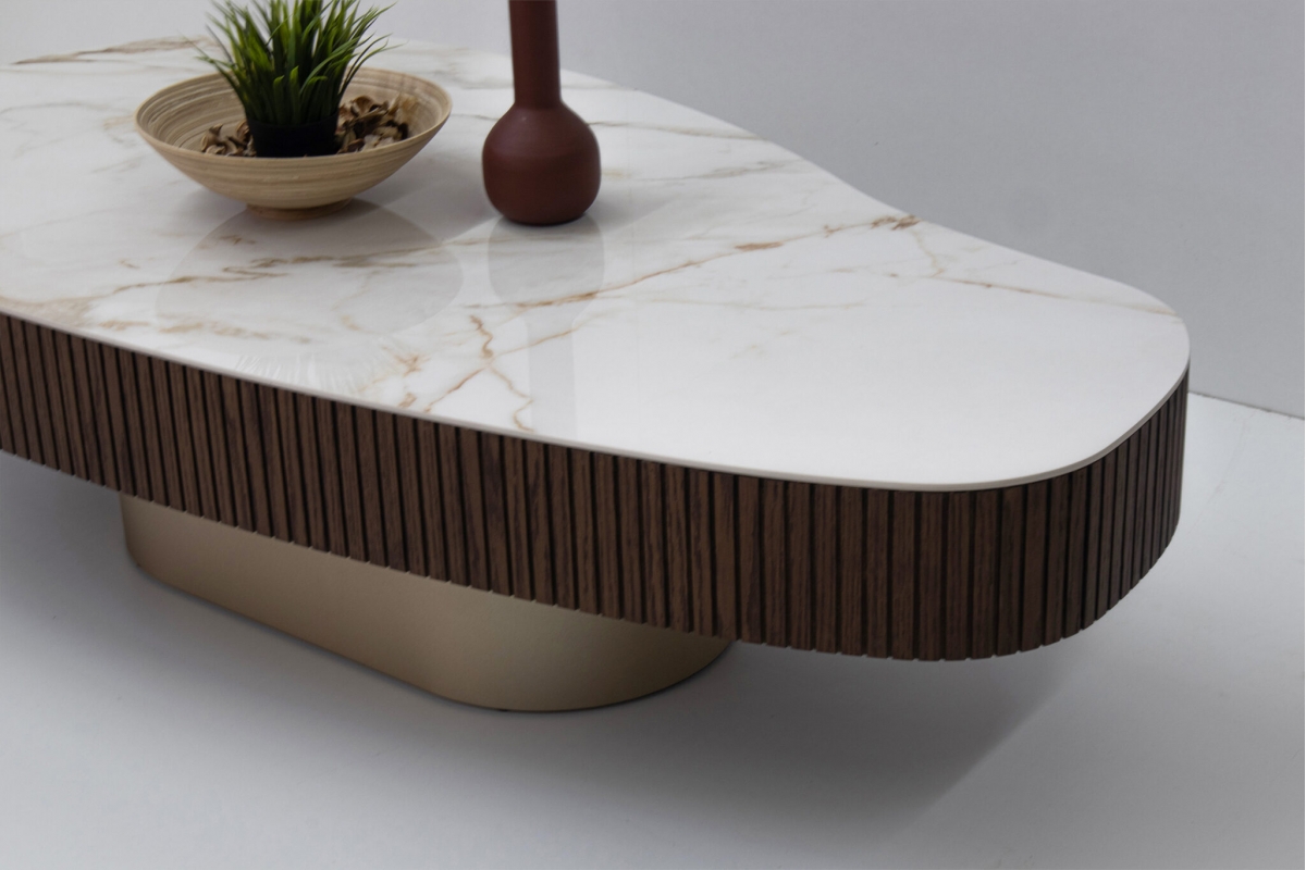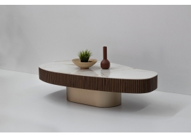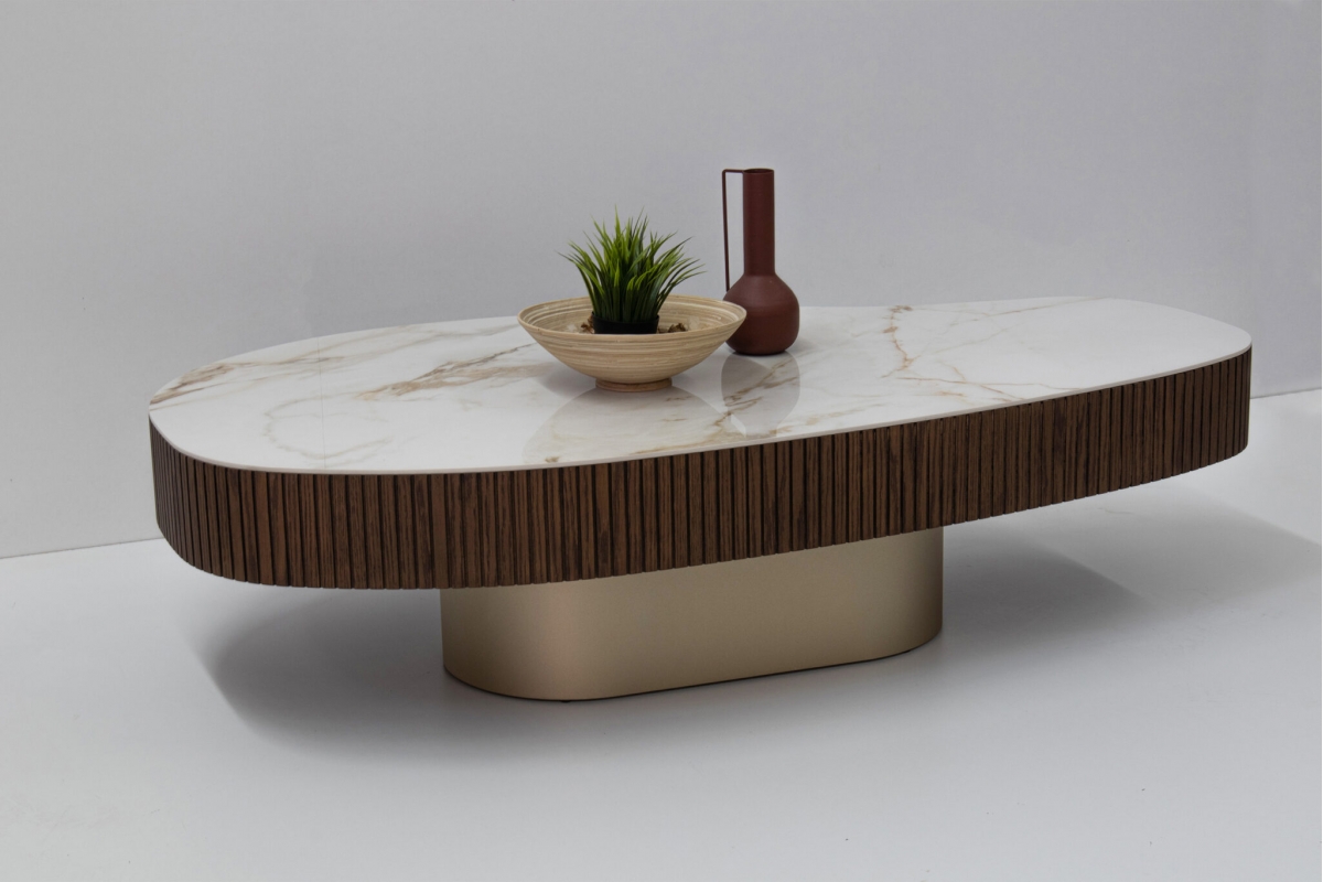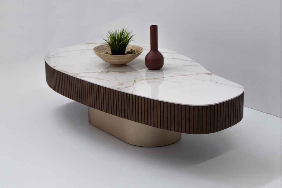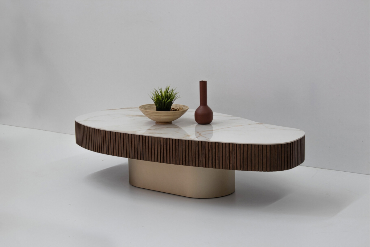 Παρουσιάζουμε το εντυπωσιακό μας σύγχρονο τραπεζάκ, που συνδυάζει μοντέρνο σχεδιασμό και φυσική κομψότητα. Διαθέτει γυαλιστερή επιφάνεια και μοναδική καμπυλωτή βάση, προσθέτοντας πολυτέλεια σε κάθε χώρο. Οι περίτεχνες ξύλινες λεπτομέρειες στην άκρη προσφέρουν ζεστή αντίθεση.