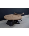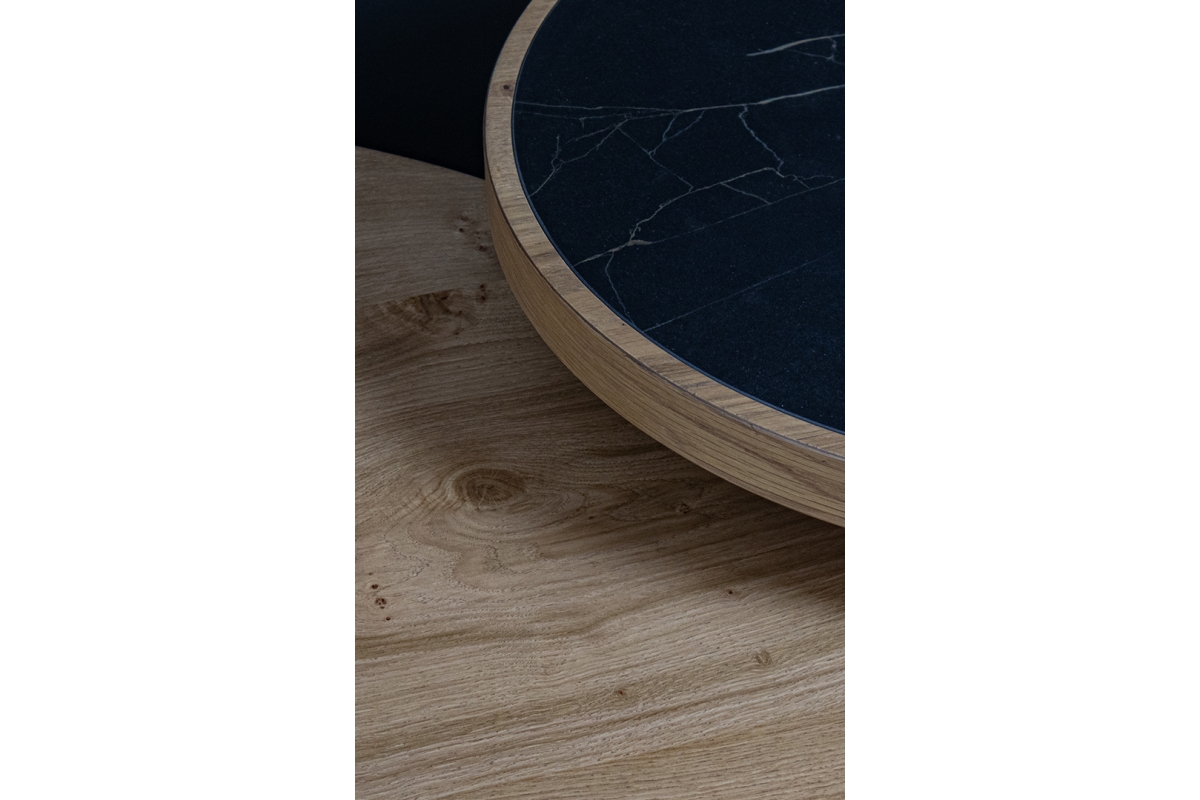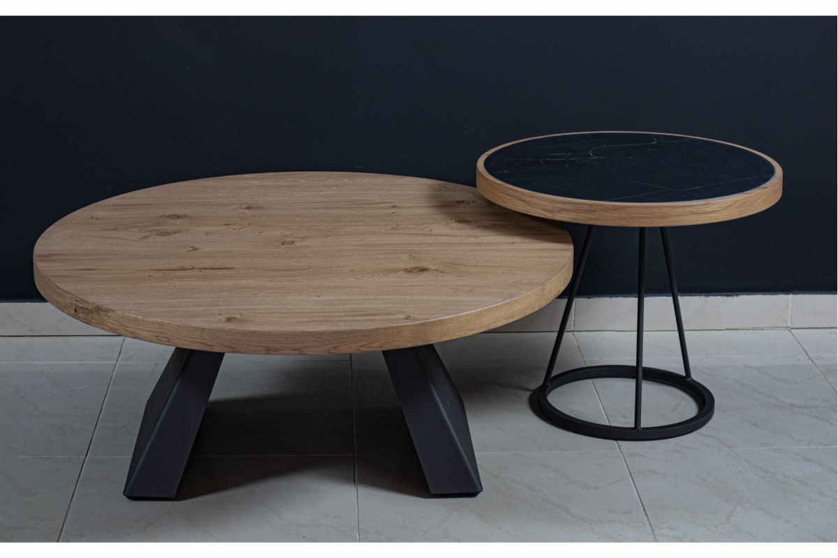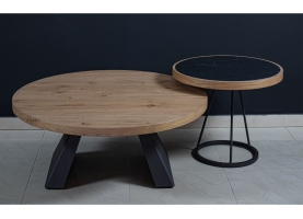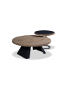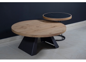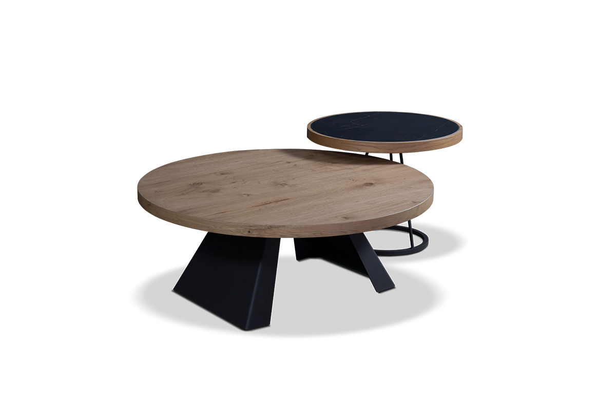Οι minimal γραμμές του το κάνουν ιδανική επιλογή για το σύγχρονο σαλόνι σαν κύριο ή συμπληρωματικό κομμάτι. Η ξύλινη, στρογγυλή επιφάνεια ενώνεται με τον ξεχωριστού σχεδιασμού μεταλλικό σκελετό και «παντρεύεται» με ένα συνοδευτικό έπιπλο με κεραμικό καπάκι σε αυτό το τραπεζάκι σαλονιού που ξεχωρίζει.
