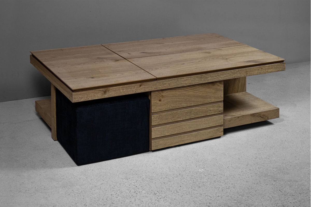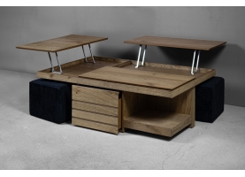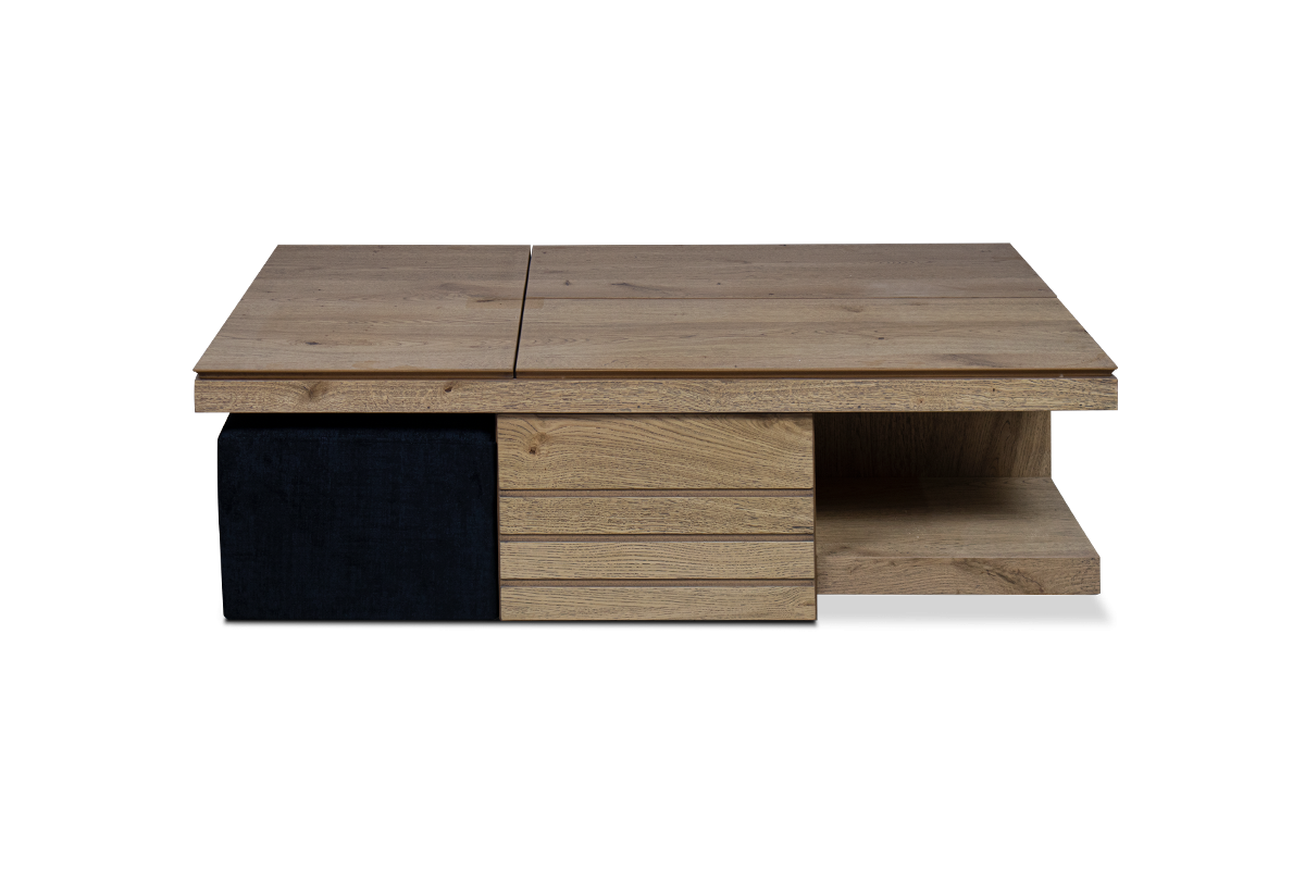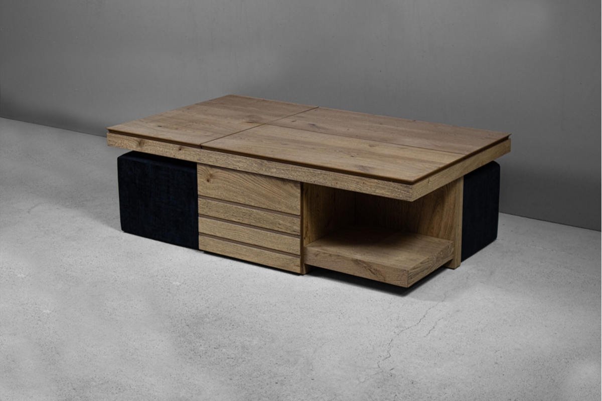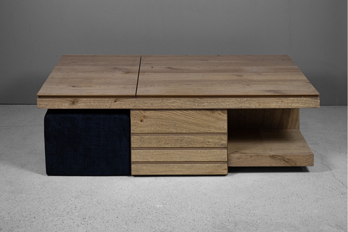 Το ξύλινο τραπεζάκι σαλονιού με τα… «χίλια πρόσωπα»! Πρόκειται για ένα τραπεζάκι σαλονιού για όσους αγαπάνε την καλή παρέα και περνάνε πολλές ώρες στο σαλόνι τους. Ο πολυμορφικός χαρακτήρας του με τους 2 σερβιτόρους, το συρτάρι κάβας αλλά και τα 2 πουφ που το συνοδεύουν το καθιστούν μία ολοκληρωμένη λύση για το σύγχρονο σαλόνι.