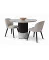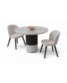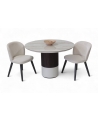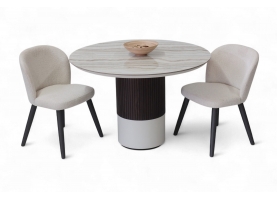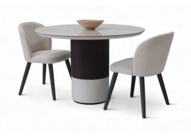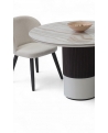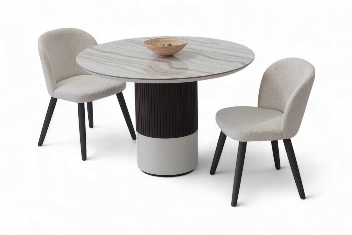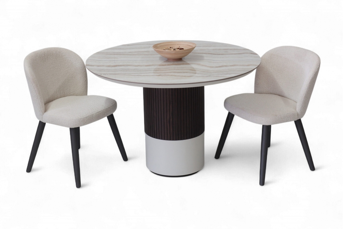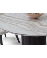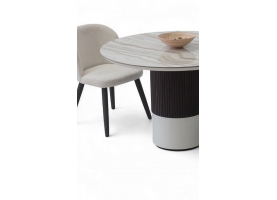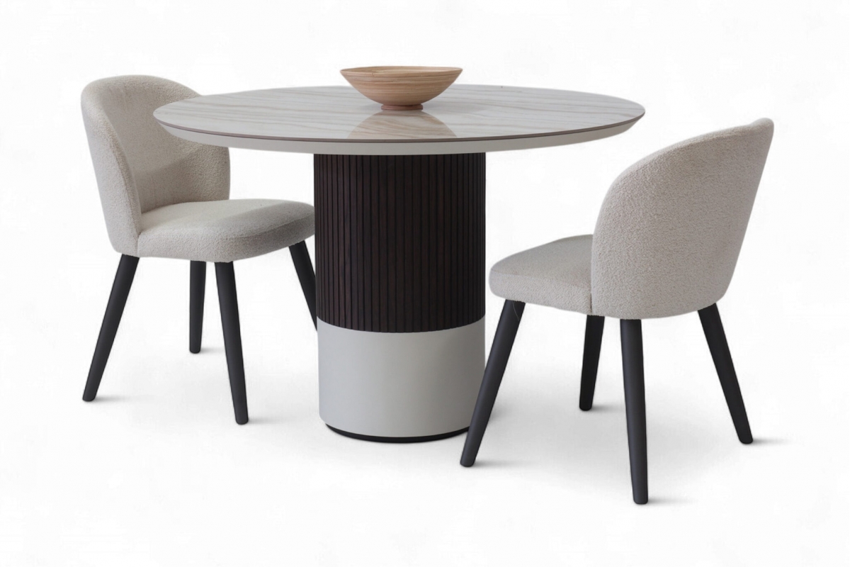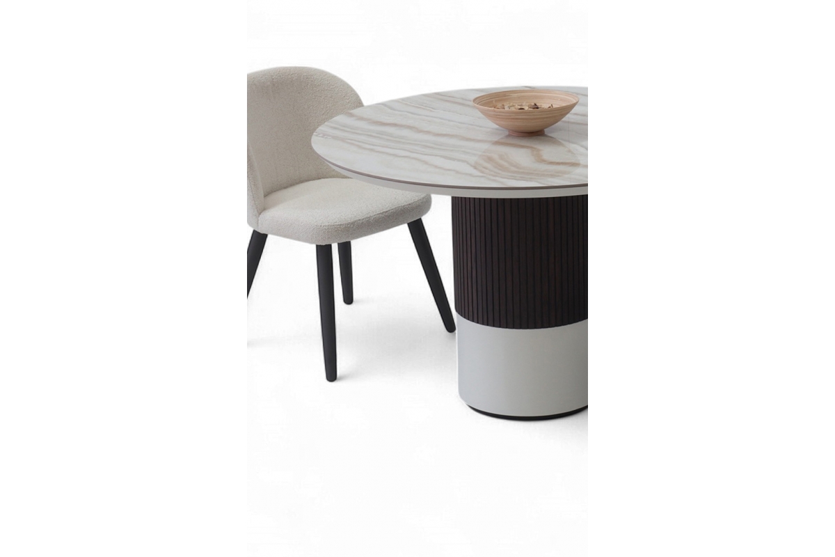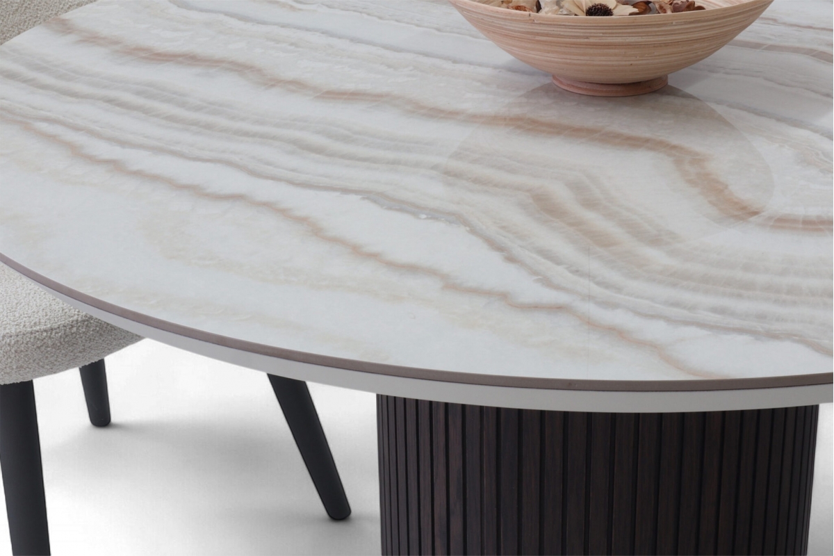 Η κεραμική επιφάνεια προσδίδει διαχρονική κομψότητα, ενώ η ξύλινη βάση σε δύο τόνους –λακαρισμένη και φυσική με λεπτομέρεια από πηχάκια– δημιουργεί ένα γλυπτικό αποτέλεσμα που αναδεικνύει τη μοντέρνα αισθητική του σχεδίου.