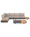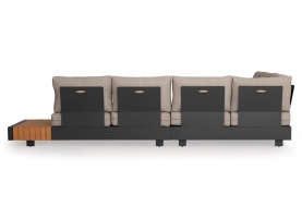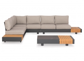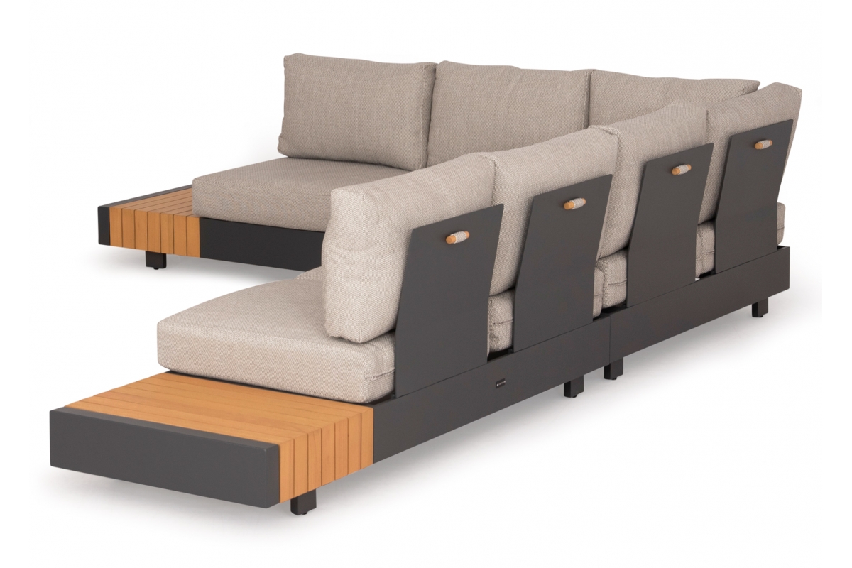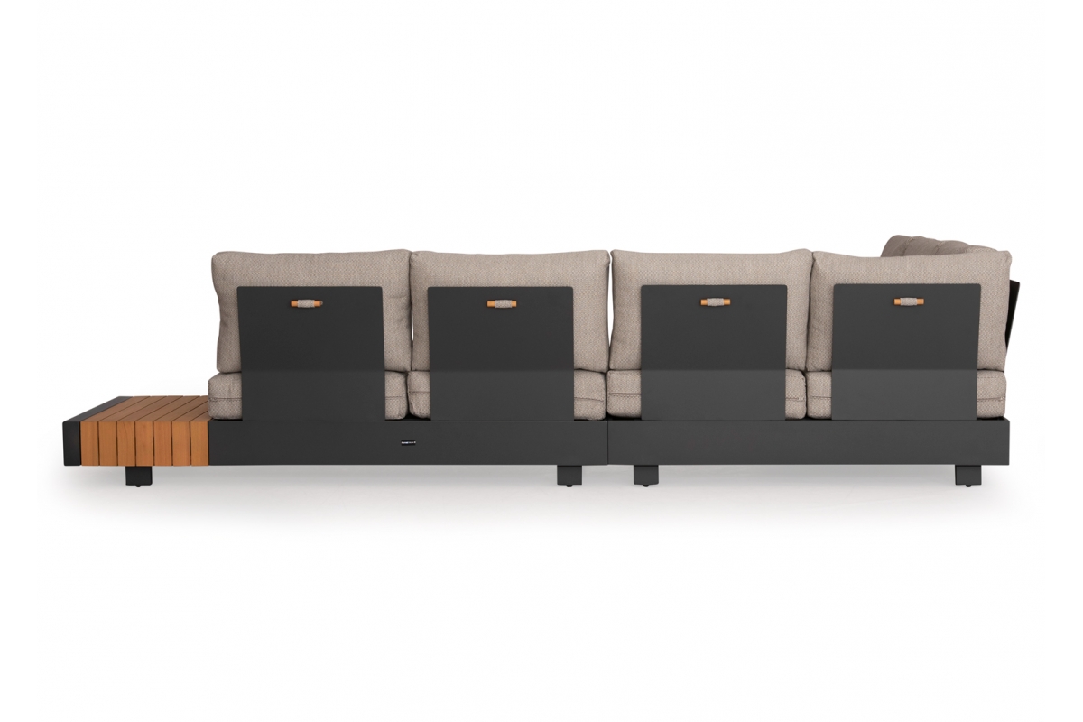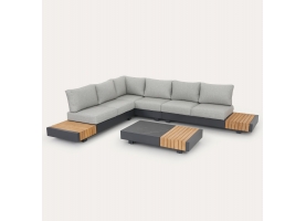 Αποτελείται από δύο 2-θέσιους καναπέδες με έξτρα επιφάνειες σε στυλ τραπεζιών, μία γωνία που ενώνει τους δύο καναπέδες, και ένα τραπεζάκι. Ο σκελετός είναι από αλουμίνιο σε ΣΚΟΥΡΟ ΓΚΡΙ χρώμα με μαξιλάρια σε πιο ΑΝΟΙΧΤΟ ΓΚΡΙ χρώμα.
