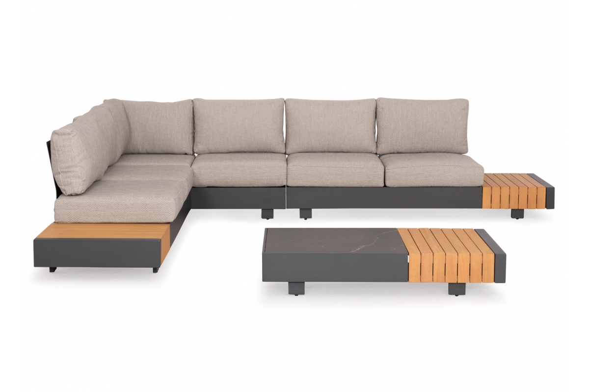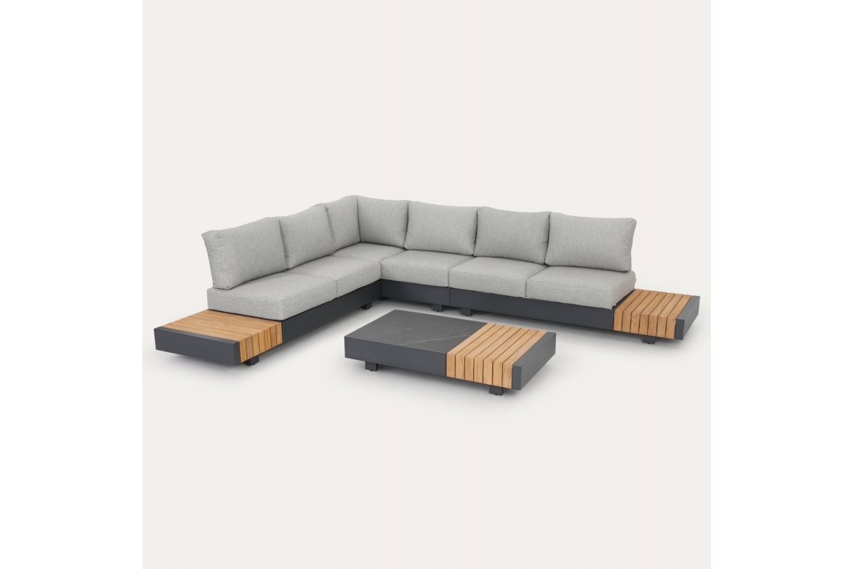 Το τραπεζάκι διαθέτει επιφάνεια από sintered stone και ξύλο ευκαλύπτου, ενώ το ίδιο ξύλο υπάρχει και στα τραπεζάκια στις δύο πλευρές της γωνίας. Ένα σετ που «ιντριγκάρει» τις αισθήσεις και σας προκαλεί να το αποκτήσετε!