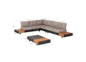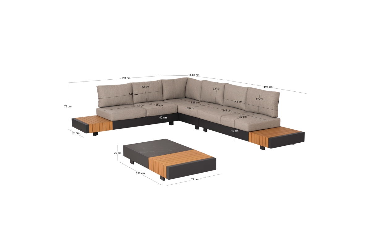 ΣΥΝΟΛΙΚΕΣ ΔΙΑΣΤΑΣΕΙΣ ΓΩΝΙΑΣ: 308,8x192x73Υ εκ. 2-ΘΕΣΙΟΙ ΚΑΝΑΠΕΔΕΣ (2): 194x78x73Υ εκ. ΓΩΝΙΑ: 114,8x78x73Υ εκ. ΤΡΑΠΕΖΑΚΙ: 130x72x25Υ εκ. Καλύμματα μαξιλαριών: OLEFIN υδατοαπωθητικό (πολυεστερικό) ύφασμα ειδικό για εξωτερική χρήση (με φερμουάρ για εύκολη αφαίρεση) Μαξιλάρια καθίσματος: 15 εκ. πάχος---Πυκνότητα αφρού: 25D Επιφάνεια τραπεζιού: 6mm πάχος sintered stone