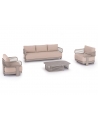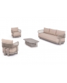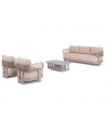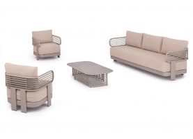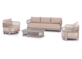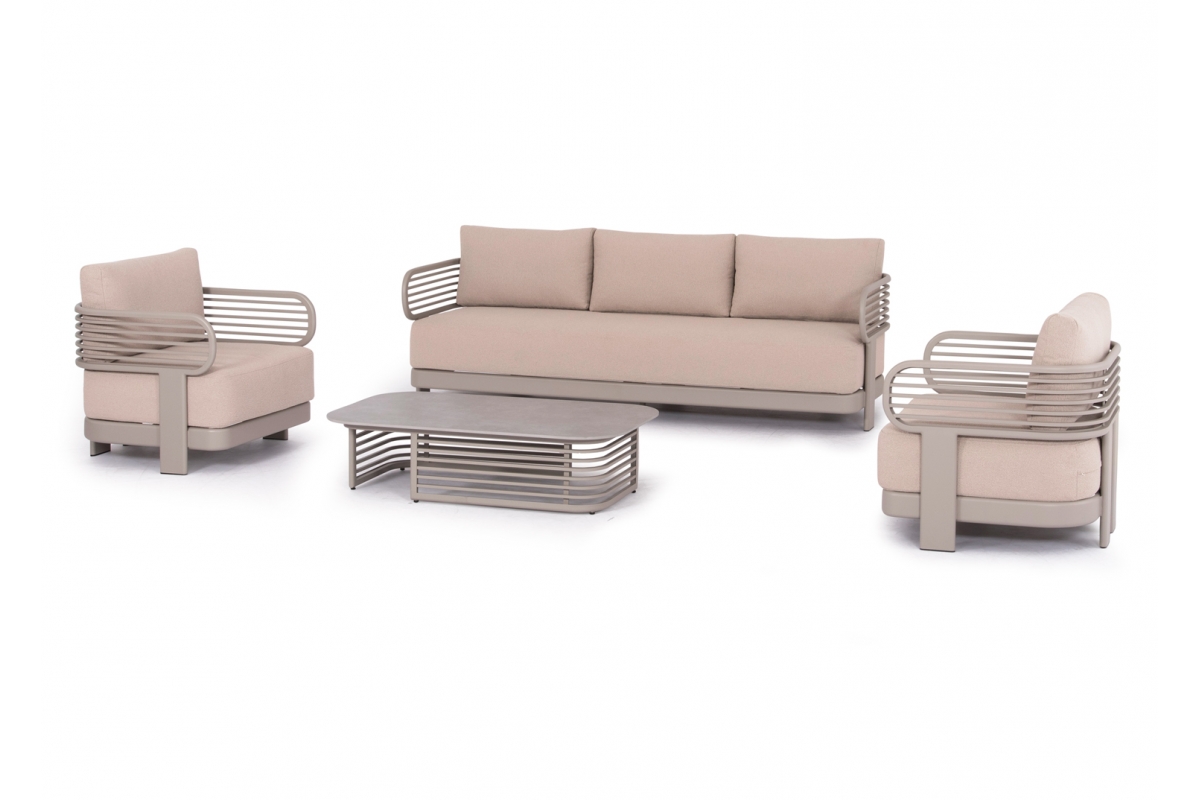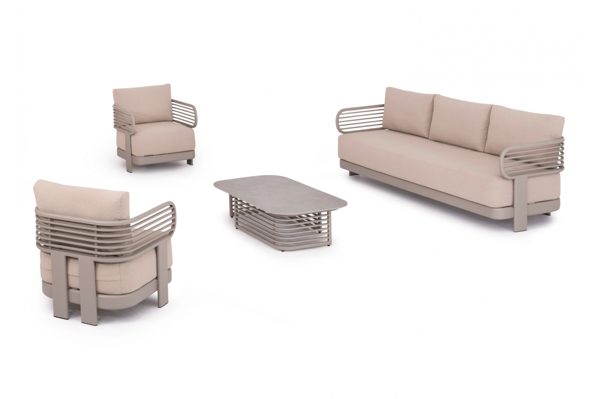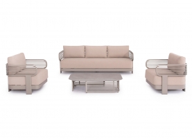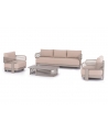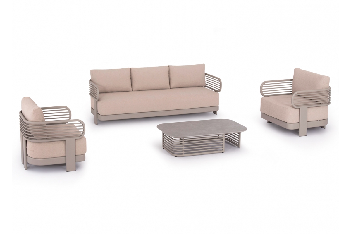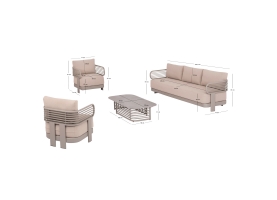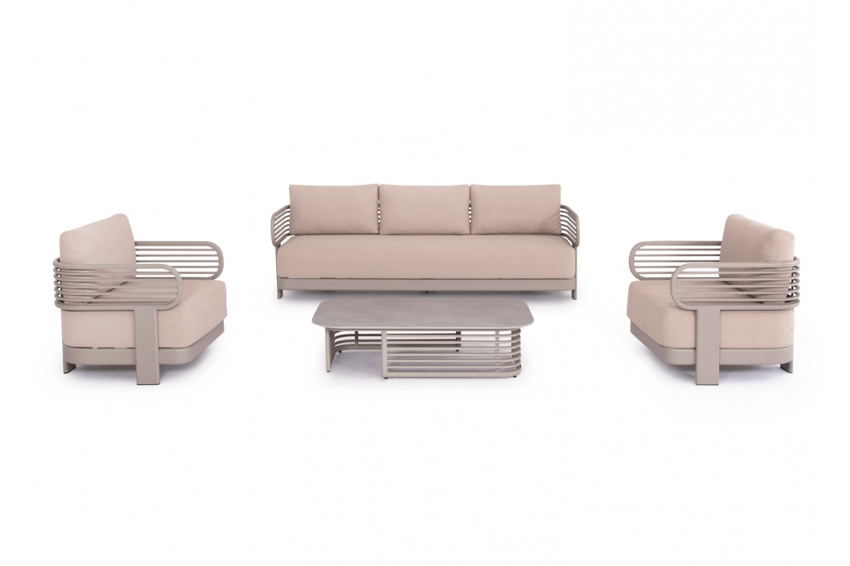 Αποτελείται από έναν 3-θέσιο καναπέ, ένα τραπεζάκι, και 2 αναπαυτικές πολυθρόνες. Ο σκελετός είναι από αλουμίνιο σε ΣΑΜΠΑΝΙ χρώμα με μαξιλάρια σε ίδιο χρώμα. Το ύφασμα OLEFIN στα μαξιλάρια είναι άλλη μία πινελιά πολυτέλειας σε όλο το σετ, ενώ το τραπεζάκι με την «πέτρινη» επιφάνεια απογειώνει ποιοτικά όλη την σύνθεση! Η αισθητική και το μοναδικό φινίρισμα κάθε σπιθαμής αυτού του σετ, θα σας κάνουν απλά να απολαμβάνετε την κάθε στιγμή!