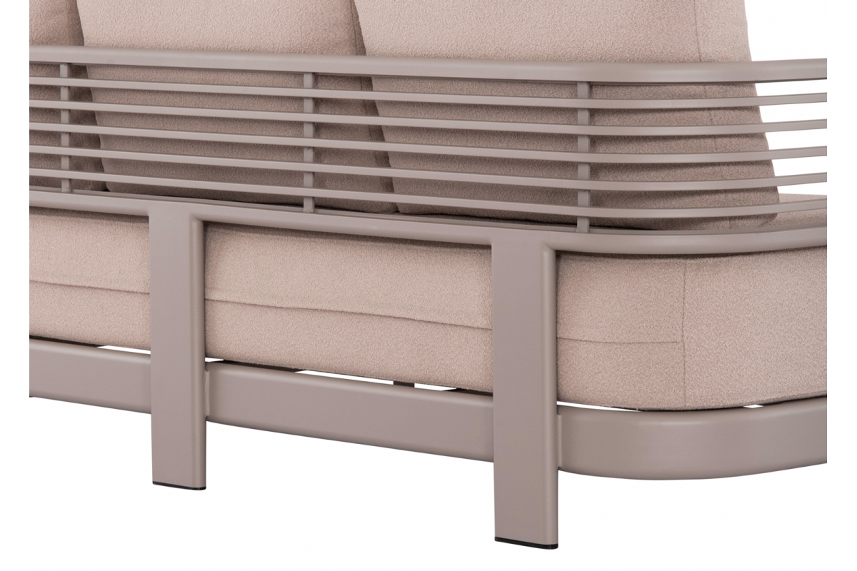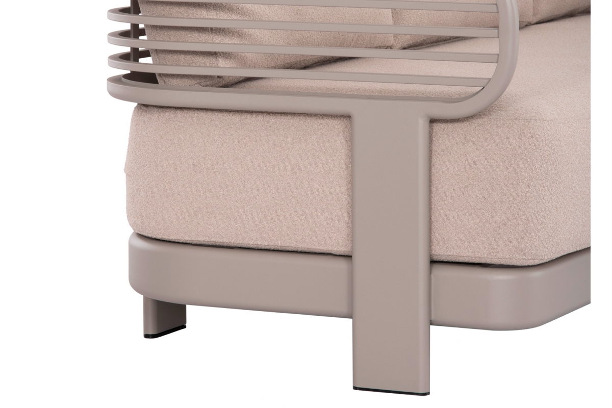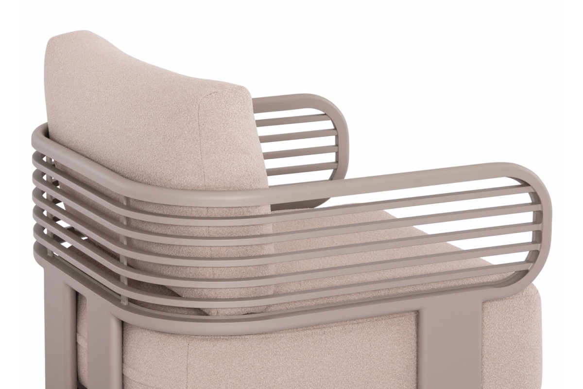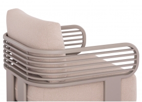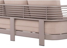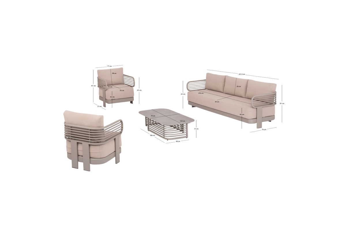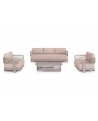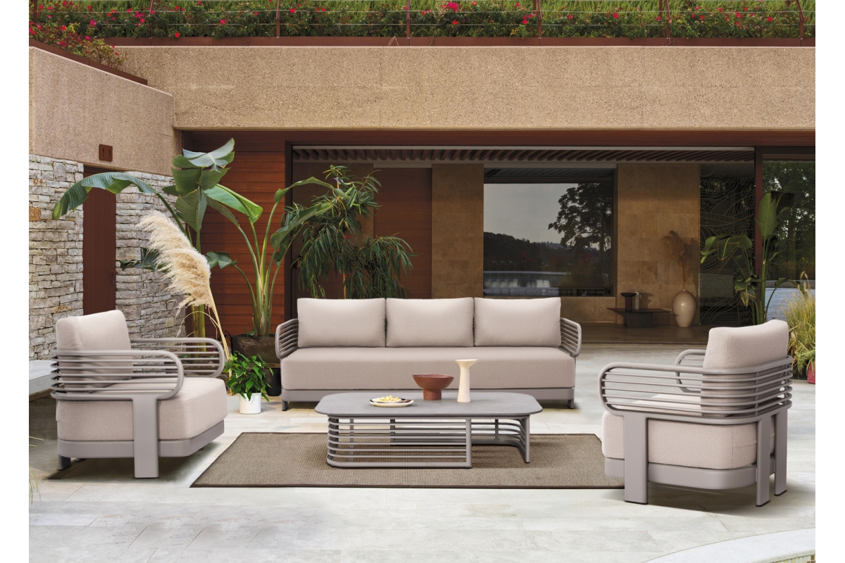 Αποτελείται από έναν 3-θέσιο καναπέ, ένα τραπεζάκι, και 2 αναπαυτικές πολυθρόνες. Ο σκελετός είναι από αλουμίνιο σε ΣΑΜΠΑΝΙ χρώμα με μαξιλάρια σε ίδιο χρώμα. Το ύφασμα OLEFIN στα μαξιλάρια είναι άλλη μία πινελιά πολυτέλειας σε όλο το σετ, ενώ το τραπεζάκι με την «πέτρινη» επιφάνεια απογειώνει ποιοτικά όλη την σύνθεση! Η αισθητική και το μοναδικό φινίρισμα κάθε σπιθαμής αυτού του σετ, θα σας κάνουν απλά να απολαμβάνετε την κάθε στιγμή!