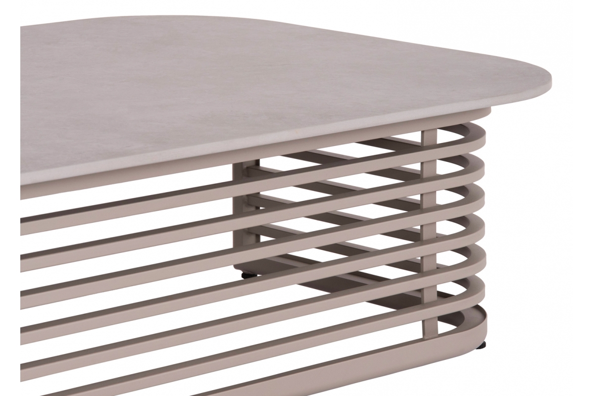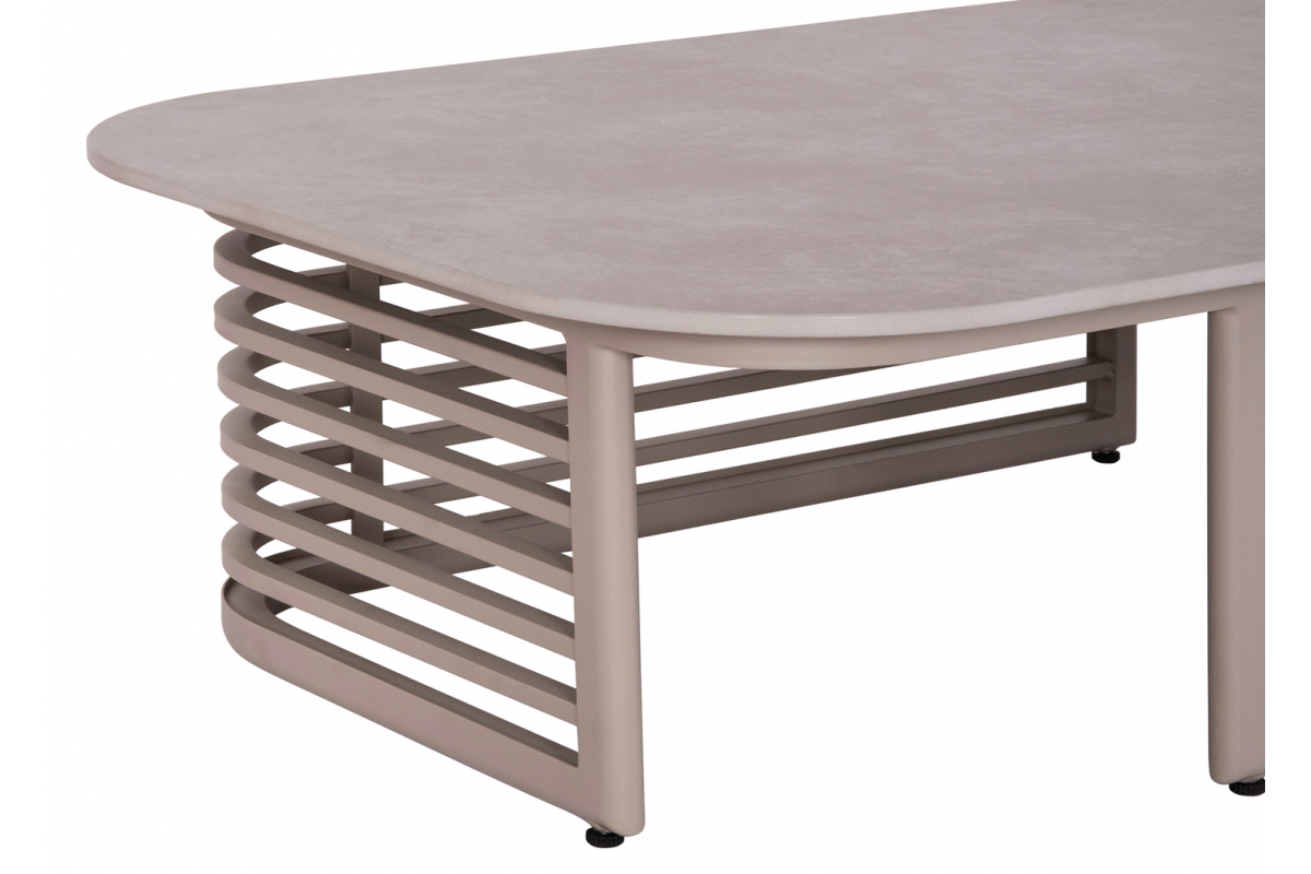 Ο σκελετός είναι από αλουμίνιο βαμμένο με ηλεκτροστατική βαφή. Το αλουμίνιο είναι ένα «πράσινο» υλικό το οποίο μπορεί να ανακυκλωθεί απεριόριστα, διατηρώντας τα χαρακτηριστικά του χωρίς καμία ποιοτική υποβάθμιση. Από την φύση του το αλουμίνιο είναι ανθεκτικό στην διάβρωση. Η επιφάνεια του τραπεζιού είναι κατασκευασμένη από ανόργανο ορυκτό υλικό που έχει σχεδιαστεί για να μοιάζει με λείο, γυαλισμένο τσιμέντο ή πέτρα.