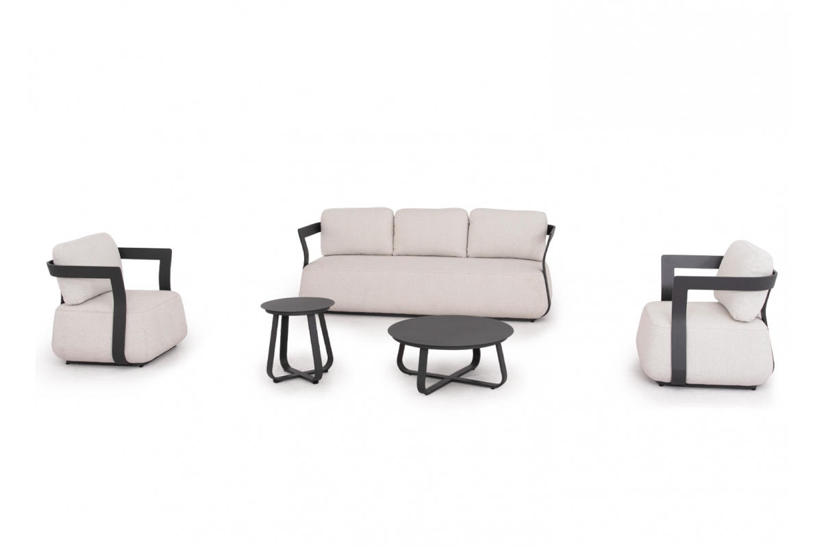 Ο σκελετός του καναπέ, των πολυθρόνων αλλά και ολόκληρα τα τραπεζάκια είναι από αλουμίνιο σε χρώμα ΣΚΟΥΡΟ ΓΚΡΙ. Το κάθισμα τόσο στον καναπέ όσο και στις πολυθρόνες είναι μαξιλάρια με πολυεστερικό ύφασμα σε ΚΡΕΜ χρώμα. Οι λιτές γραμμές, η απαράμιλλη άνεση που προσφέρει, και τα εξαιρετικά υλικά κατασκευής σε όλο το σετ, δεν αφήνουν κανένα περιθώριο αμφισβήτησης. Το σετ SERGIO θα το λατρέψετε με την πρώτη ματιά!