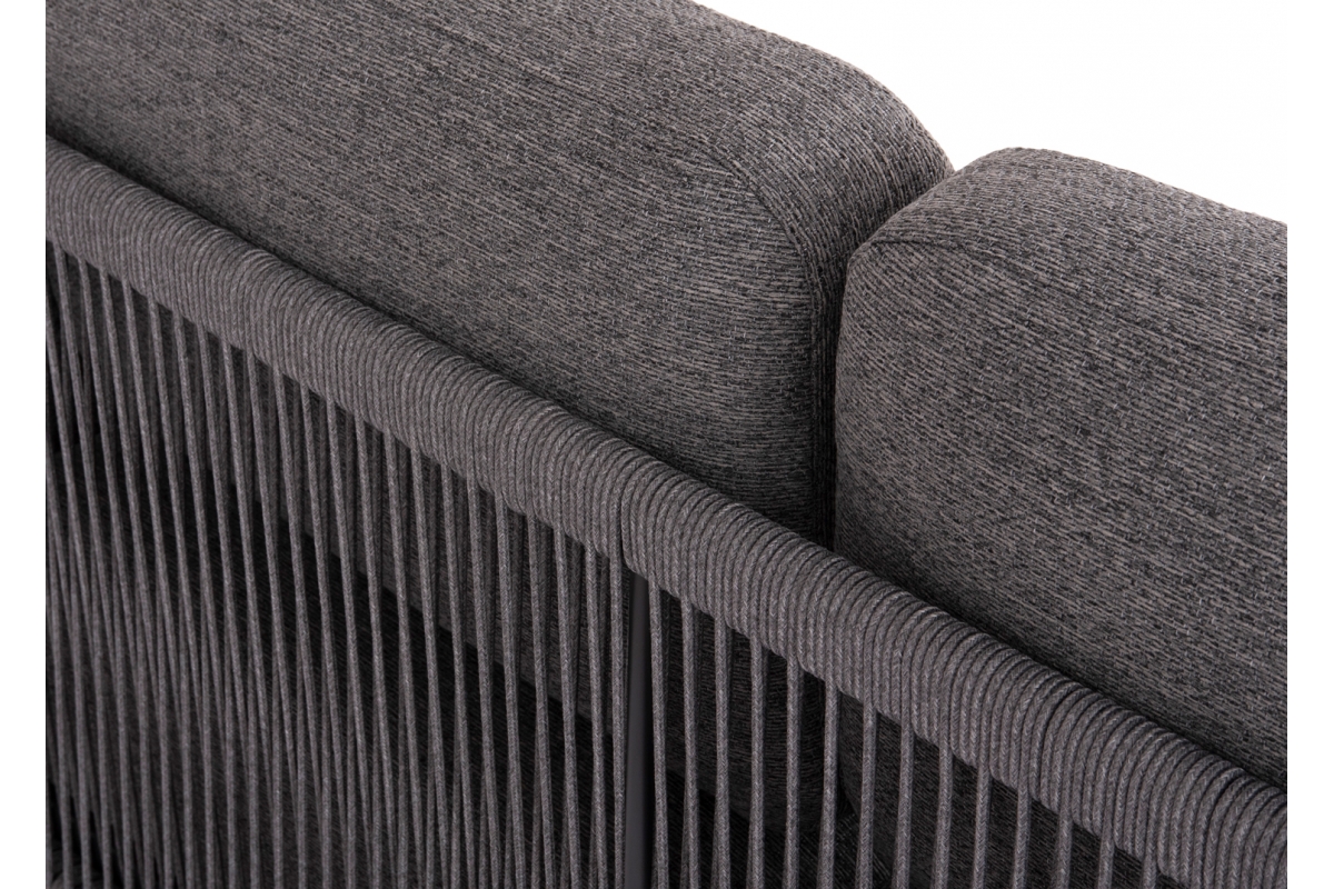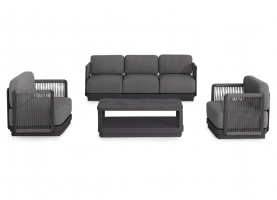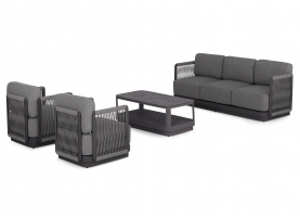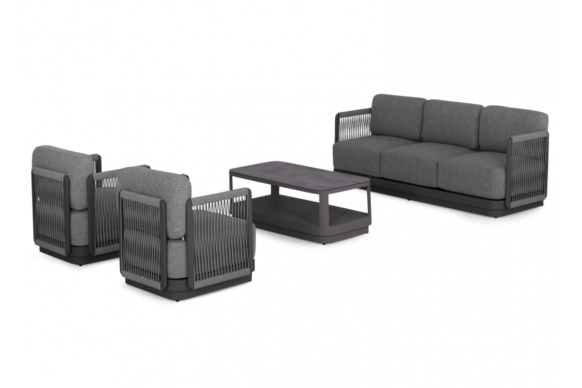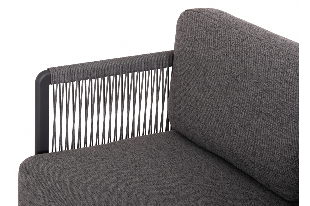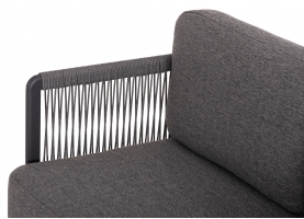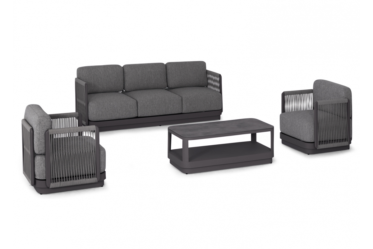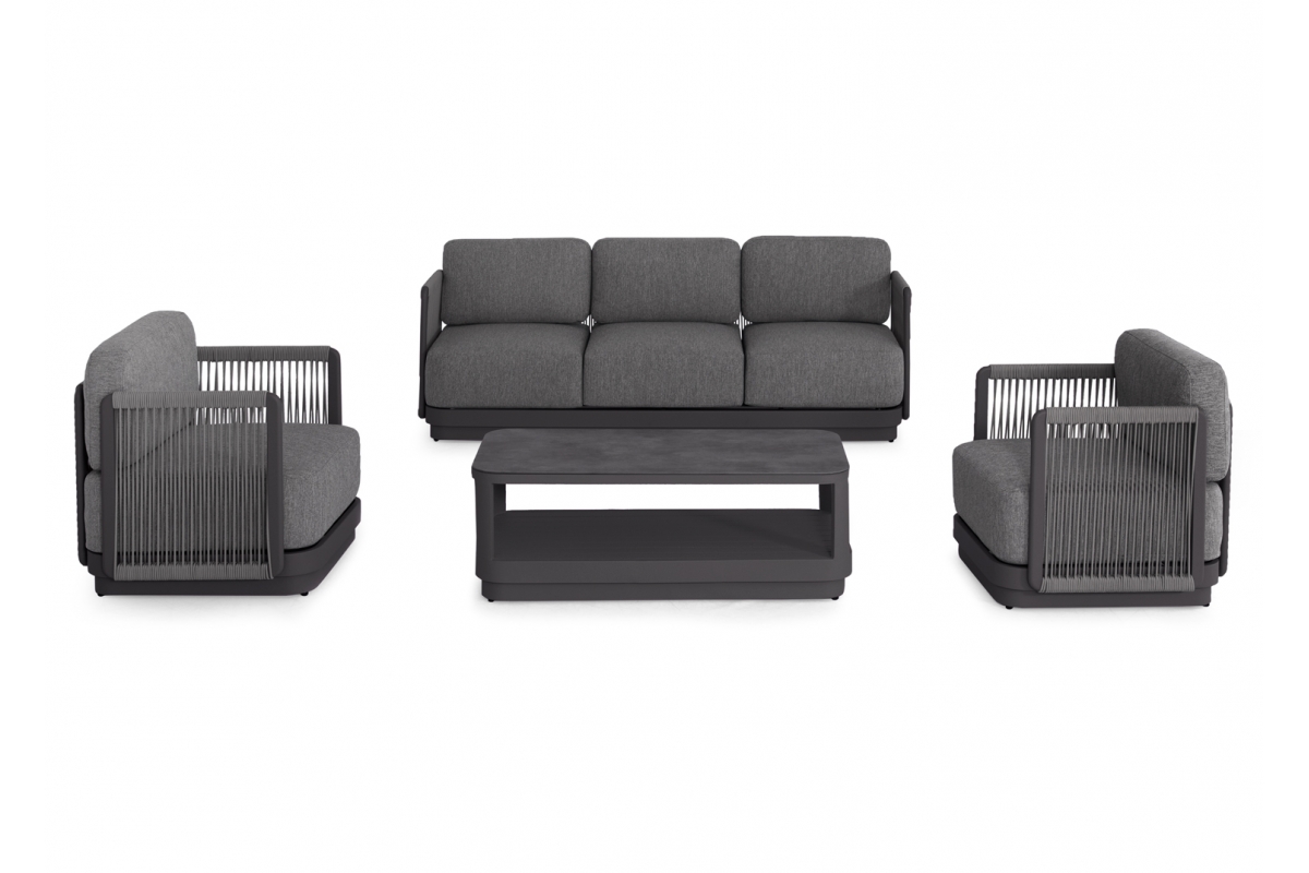 Ο σκελετός είναι από αλουμίνιο σε ΣΚΟΥΡΟ ΓΚΡΙ χρώμα με μαξιλάρια σε ίδιο χρώμα. Το πολυεστερικό ύφασμα, το σχοινί στα μπράτσα αλλά και η αλουμινένια επιφάνεια στο τραπεζάκι με την όψη πέτρας απογειώνουν ποιοτικά όλη την σύνθεση! Η αισθητική και το μοναδικό φινίρισμα κάθε σπιθαμής αυτού του σετ, θα σας κάνουν απλά να απολαμβάνετε την κάθε στιγμή!