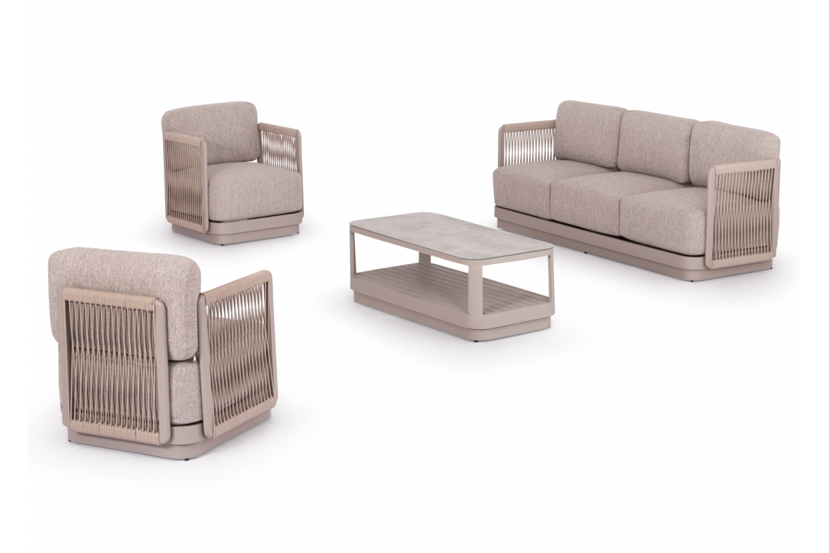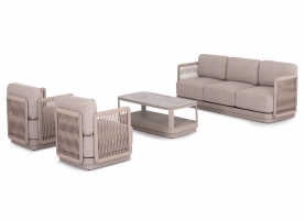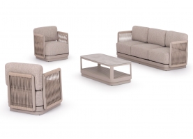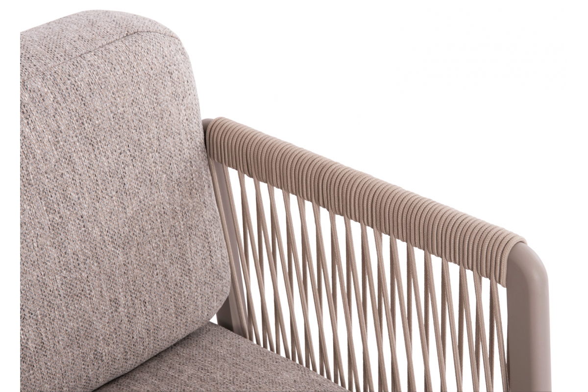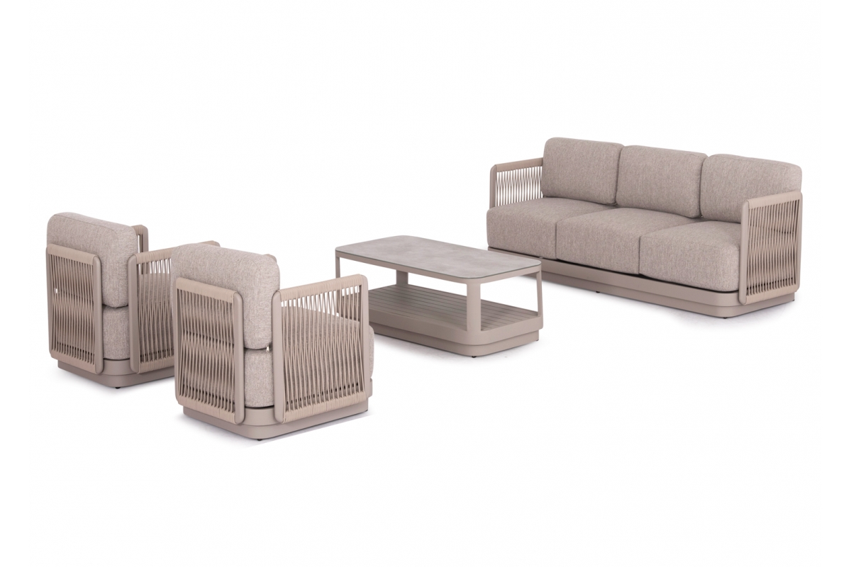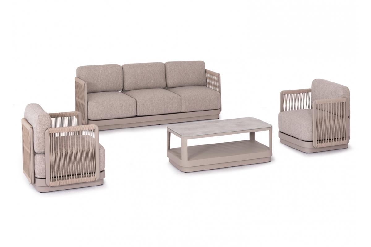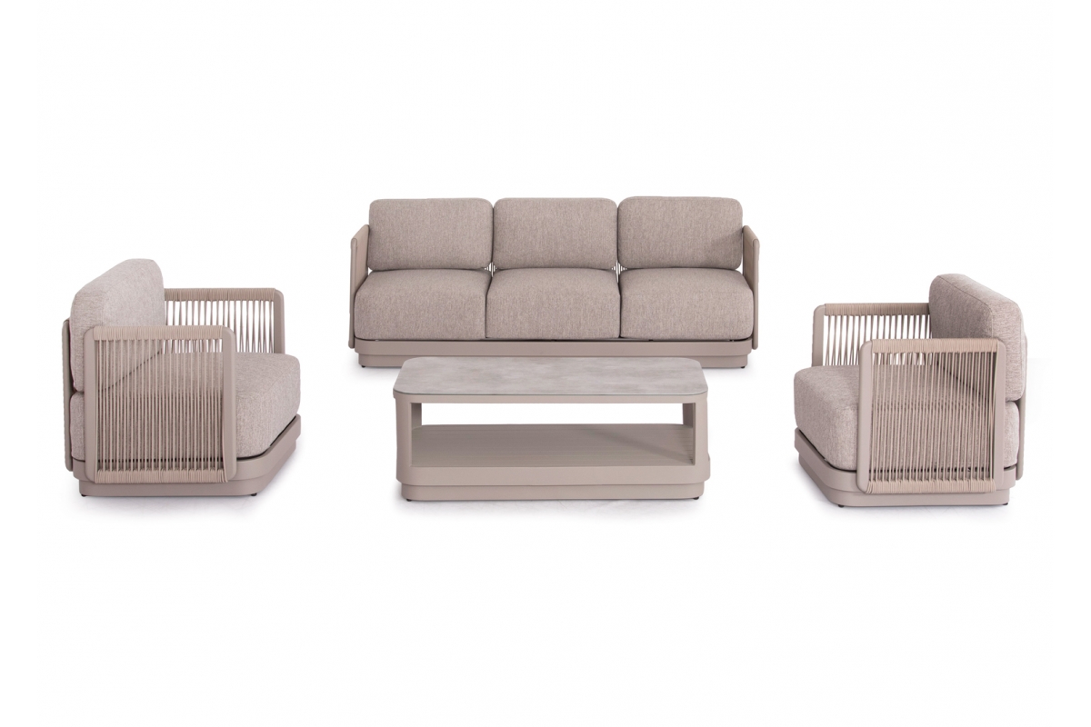 Ο σκελετός είναι από αλουμίνιο σε Ανοιχτό γκρι και Σαμπανί χρώμα με μαξιλάρια σε ίδιο χρώμα. Το πολυεστερικό ύφασμα, το σχοινί στα μπράτσα αλλά και η αλουμινένια επιφάνεια στο τραπεζάκι με την όψη πέτρας απογειώνουν ποιοτικά όλη την σύνθεση! Η αισθητική και το μοναδικό φινίρισμα κάθε σπιθαμής αυτού του σετ, θα σας κάνουν απλά να απολαμβάνετε την κάθε στιγμή!