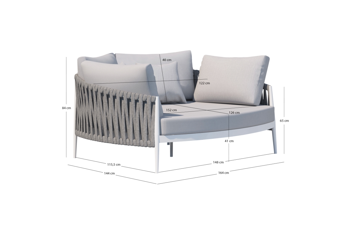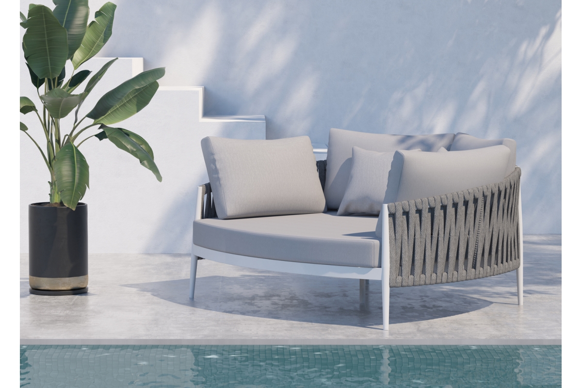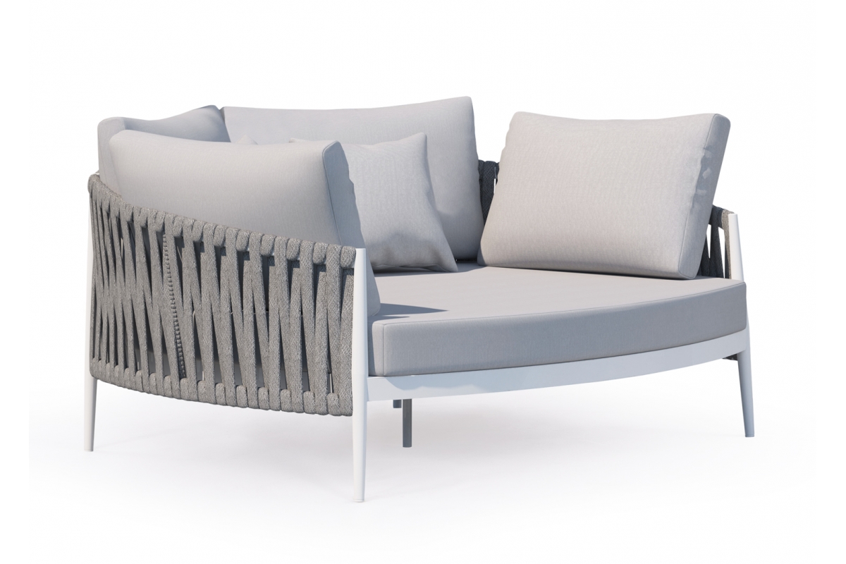 Η σειρά SELOB, ήρθε και με την απλότητά της σε συνδυασμό με την απαράμιλλη ποιότητα των υλικών της και του φινιρίσματός της, αλλάζει τα δεδομένα στην κατηγορία. Αυτό το ημικυκλικό daybed έχει σκελετό αλουμινίου σε ΛΕΥΚΟ ΚΡΕΜ χρώμα ενώ τα μαξιλάρια τόσο στο κάθισμα/στρώμα, όσο και της πλάτης είναι από OLEFIN ύφασμα σε ΜΠΕΖ χρώμα.