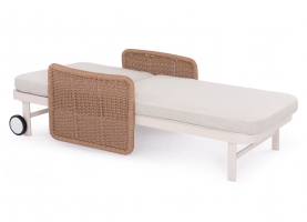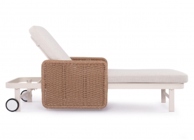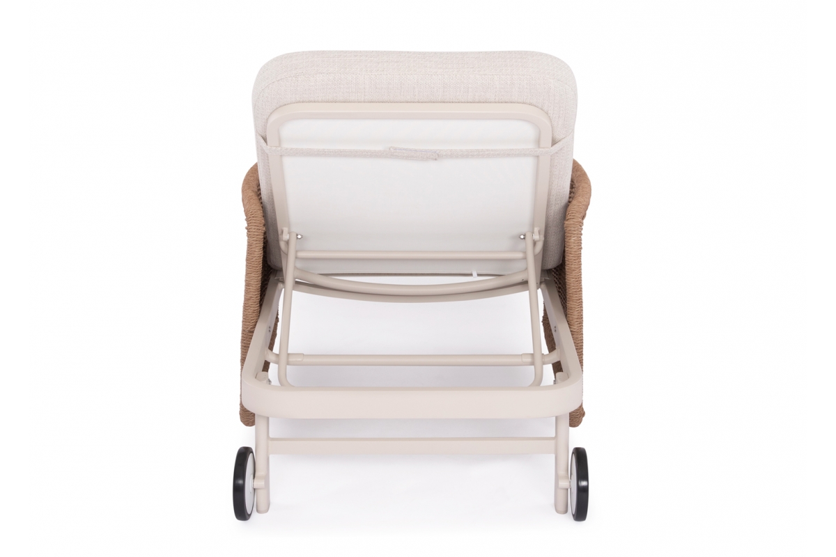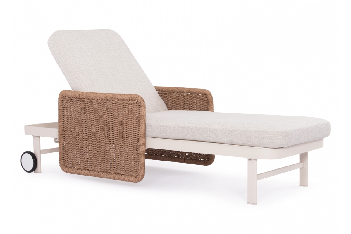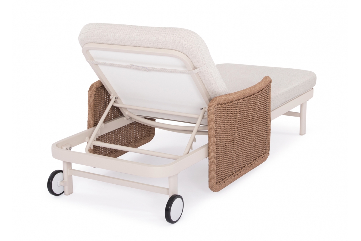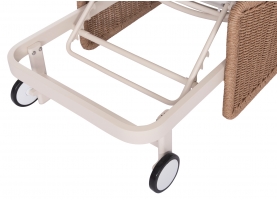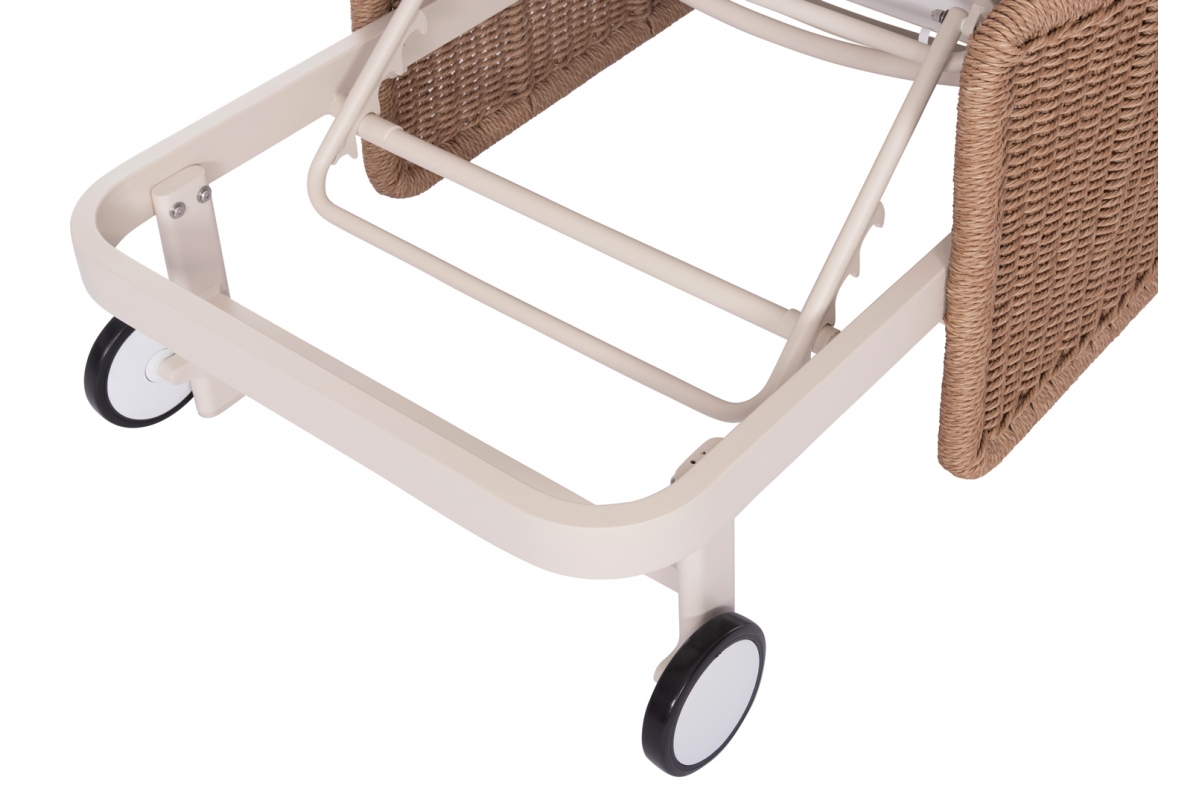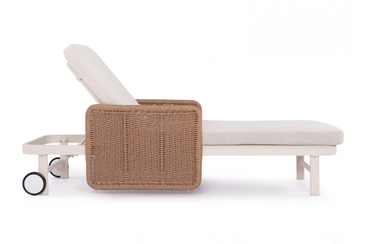 Με απαράμιλλη ποιότητα κατασκευής και υλικών, θα αναβαθμίσει την εικόνα σε όποιο χώρο επιθυμείτε. Ο σκελετός αυτής της ξαπλώστρας είναι σε χρώμα ΕΚΡΟΥ, ενώ τα μπράτσα της είναι επενδυμένα με rattan σε πλέξη wicker. Η ανάκλιση πραγματοποιείται με κλασική «σκαλιέρα» 4 θέσεων συν μία που είναι η οριζόντια. Το επάνω μέρος του στρώματος διαθέτει κορδόνια που δένονται με «χρατς» ενώ το κυρίως στρώμα «κολλάει» στην ξαπλώστρα επίσης με «χρατς», τα οποία βρίσκονται στο πανί textilene που λειτουργεί και ως βάση για το στρώμα. Τέλος, η ξαπλώστρα διαθέτει και 2 ρόδες για εύκολη μετακίνηση!