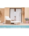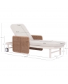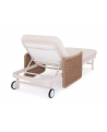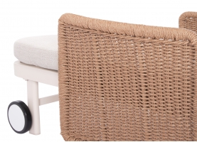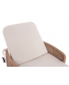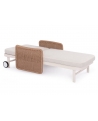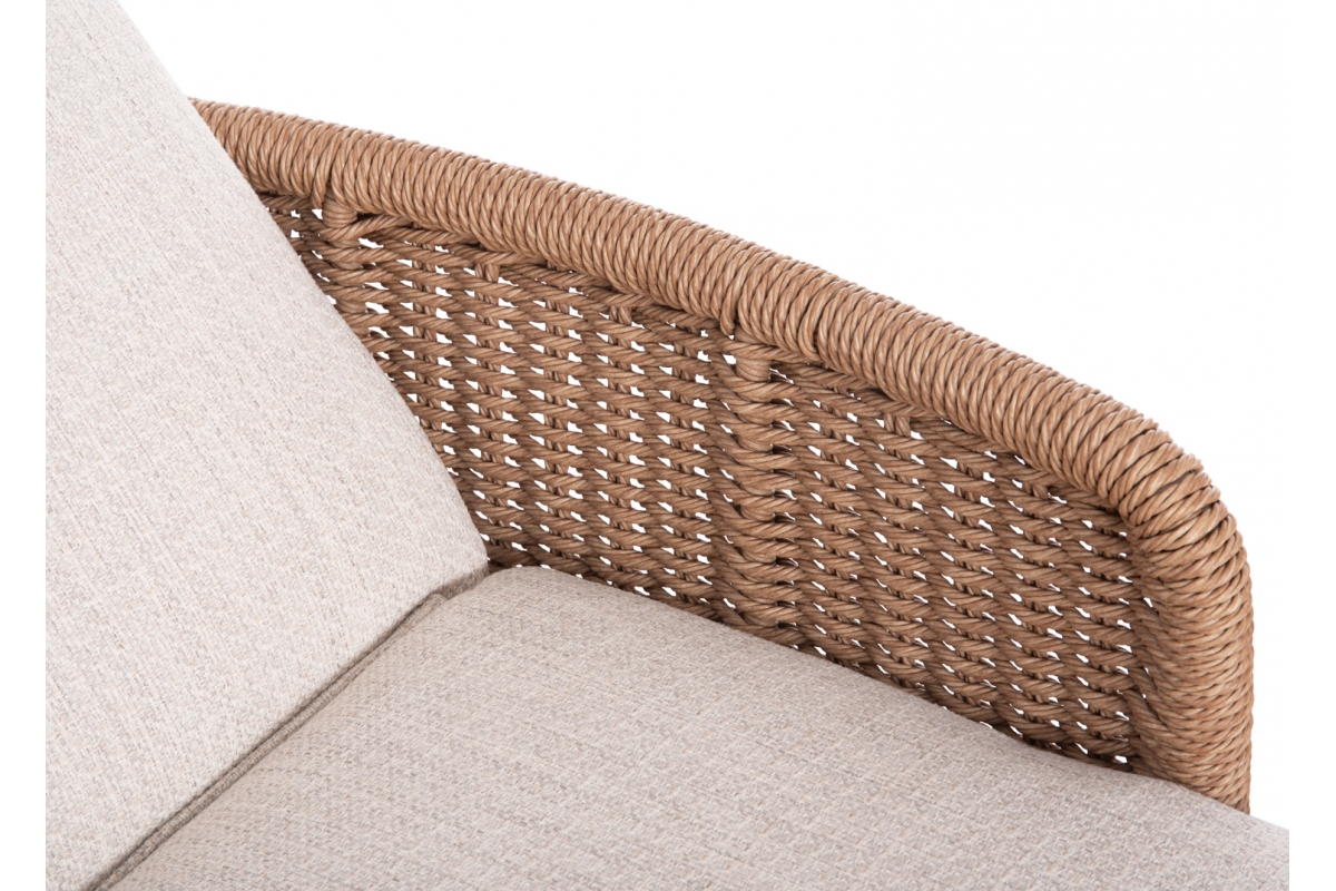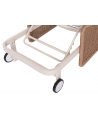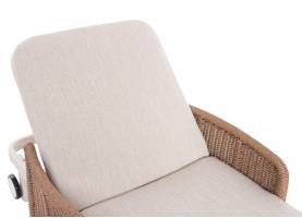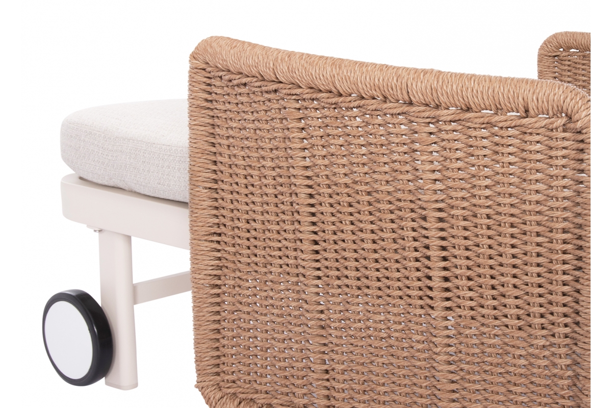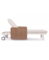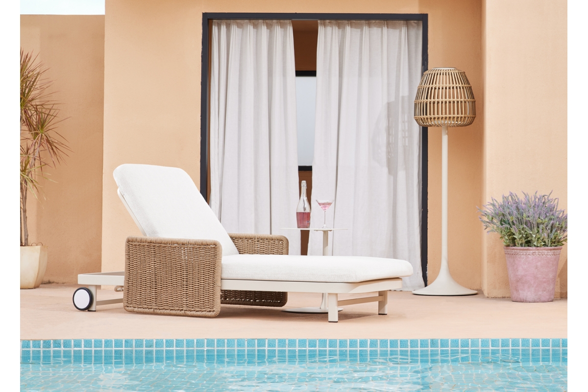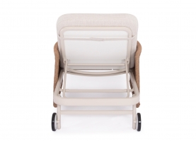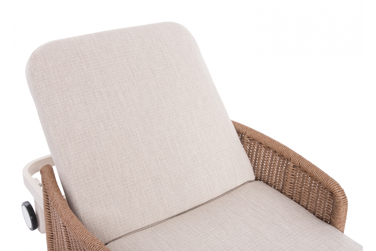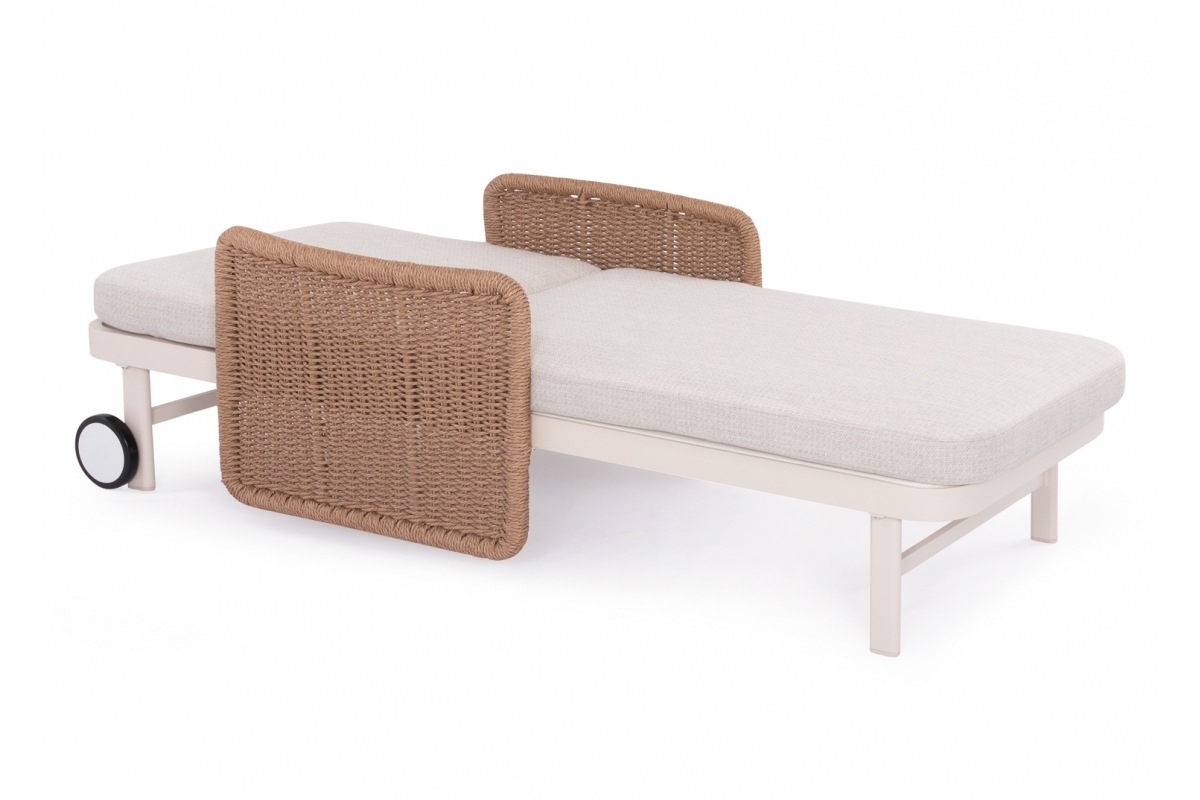 Με απαράμιλλη ποιότητα κατασκευής και υλικών, θα αναβαθμίσει την εικόνα σε όποιο χώρο επιθυμείτε. Ο σκελετός αυτής της ξαπλώστρας είναι σε χρώμα ΕΚΡΟΥ, ενώ τα μπράτσα της είναι επενδυμένα με rattan σε πλέξη wicker. Η ανάκλιση πραγματοποιείται με κλασική «σκαλιέρα» 4 θέσεων συν μία που είναι η οριζόντια. Το επάνω μέρος του στρώματος διαθέτει κορδόνια που δένονται με «χρατς» ενώ το κυρίως στρώμα «κολλάει» στην ξαπλώστρα επίσης με «χρατς», τα οποία βρίσκονται στο πανί textilene που λειτουργεί και ως βάση για το στρώμα. Τέλος, η ξαπλώστρα διαθέτει και 2 ρόδες για εύκολη μετακίνηση!