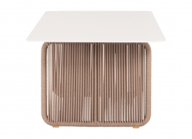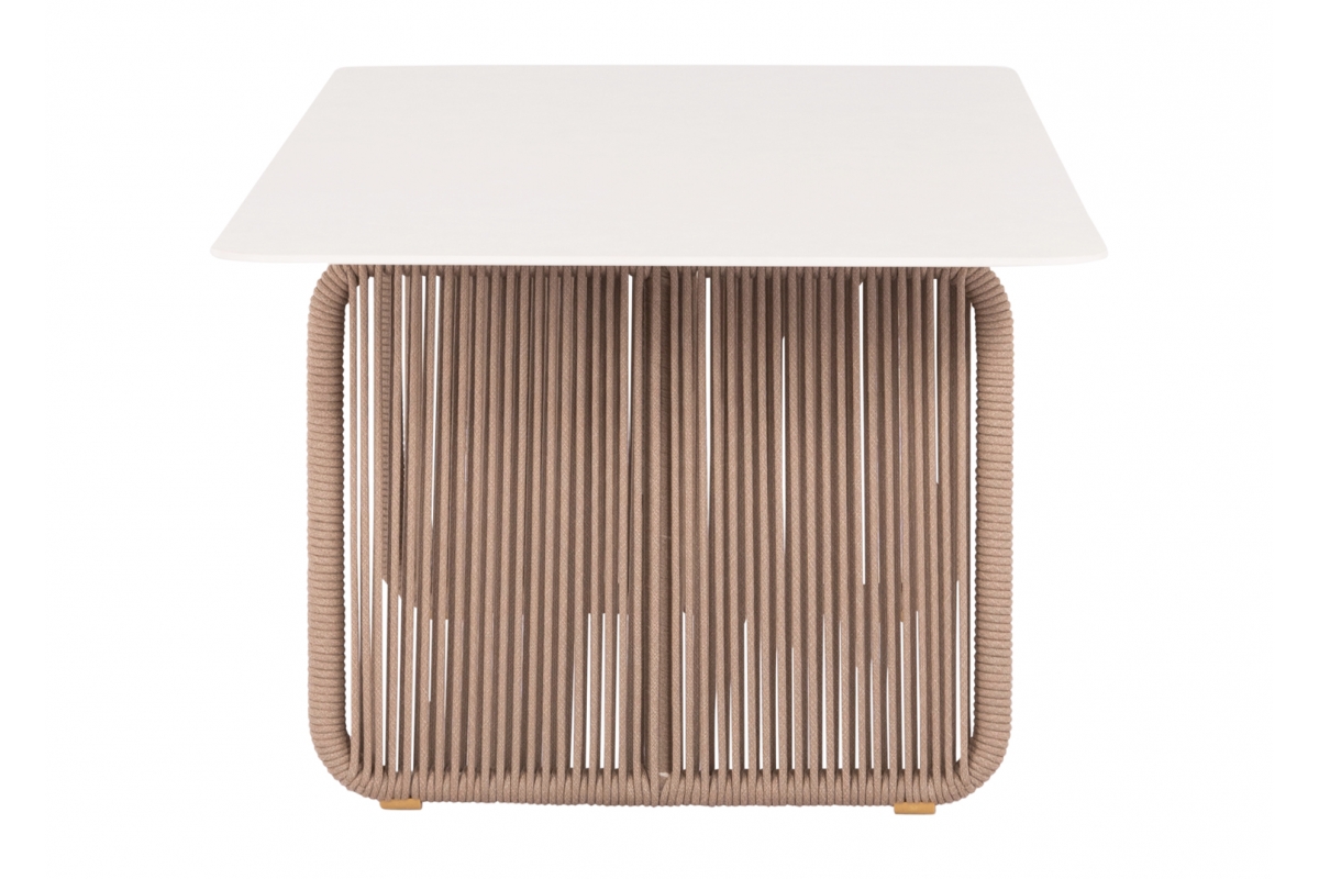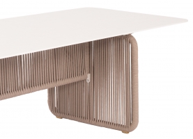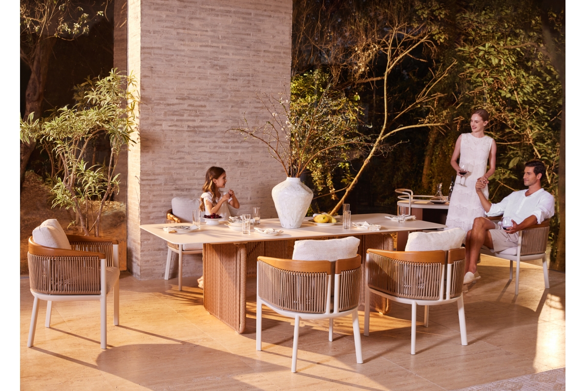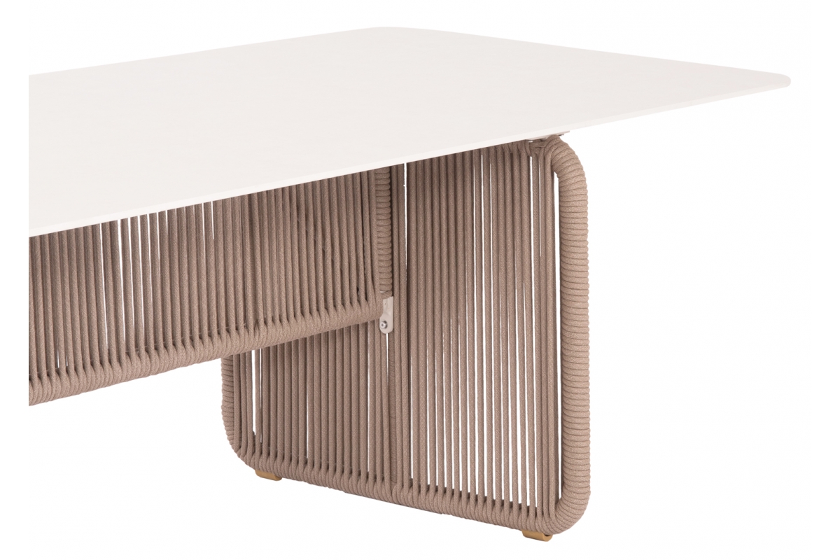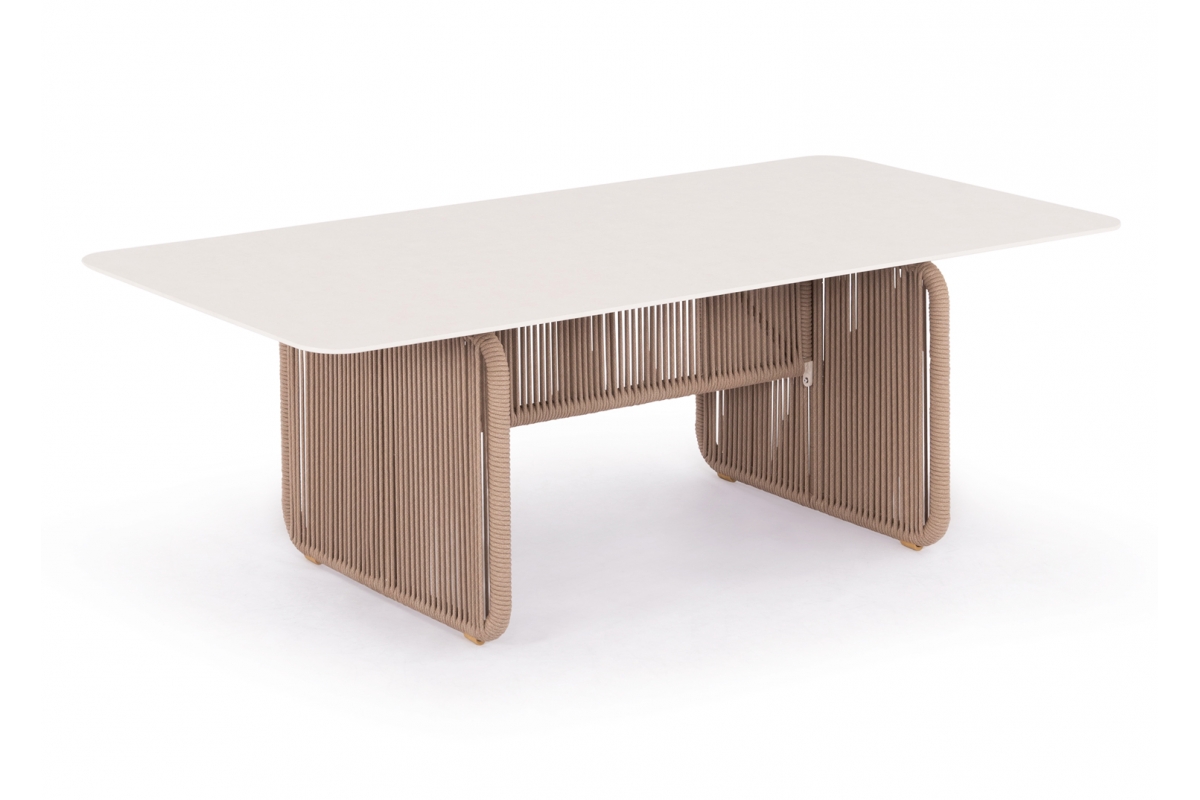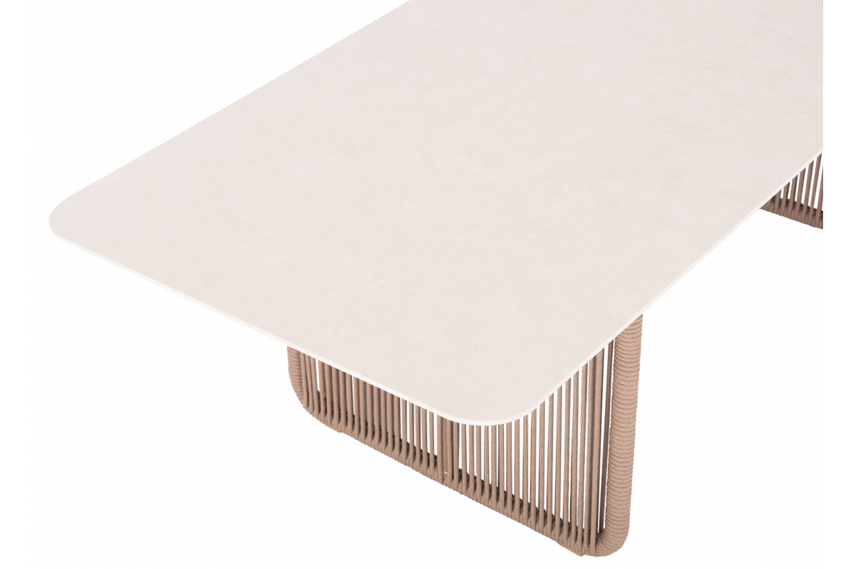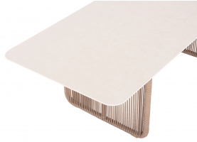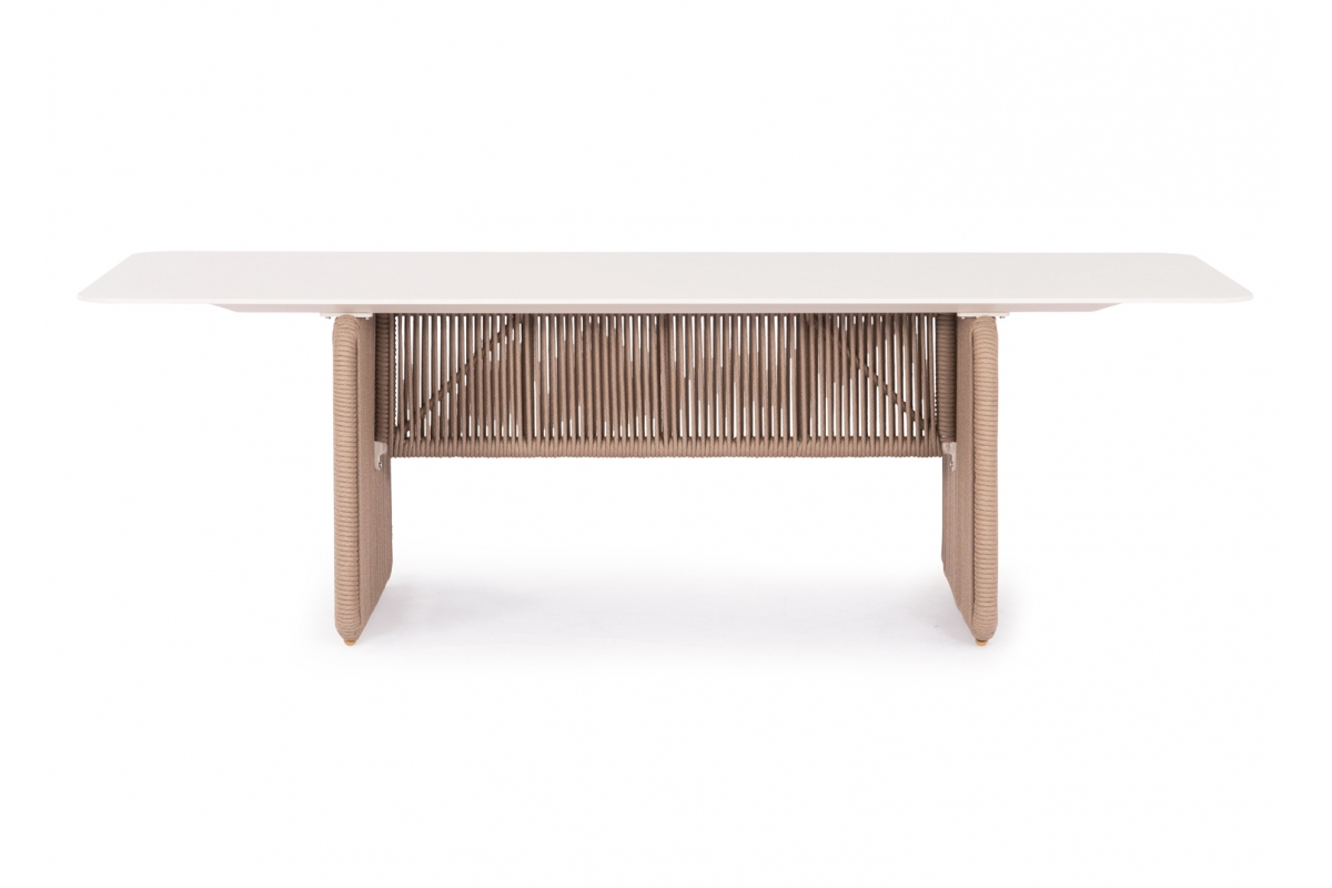 Σας παρουσιάζουμε ένα εντυπωσιακό τραπέζι εξωτερικού χώρου της σειράς ETERNIA με ΜΠΕΖ σχοινί και ΕΚΡΟΥ επιφάνεια από SINTERED STONE.