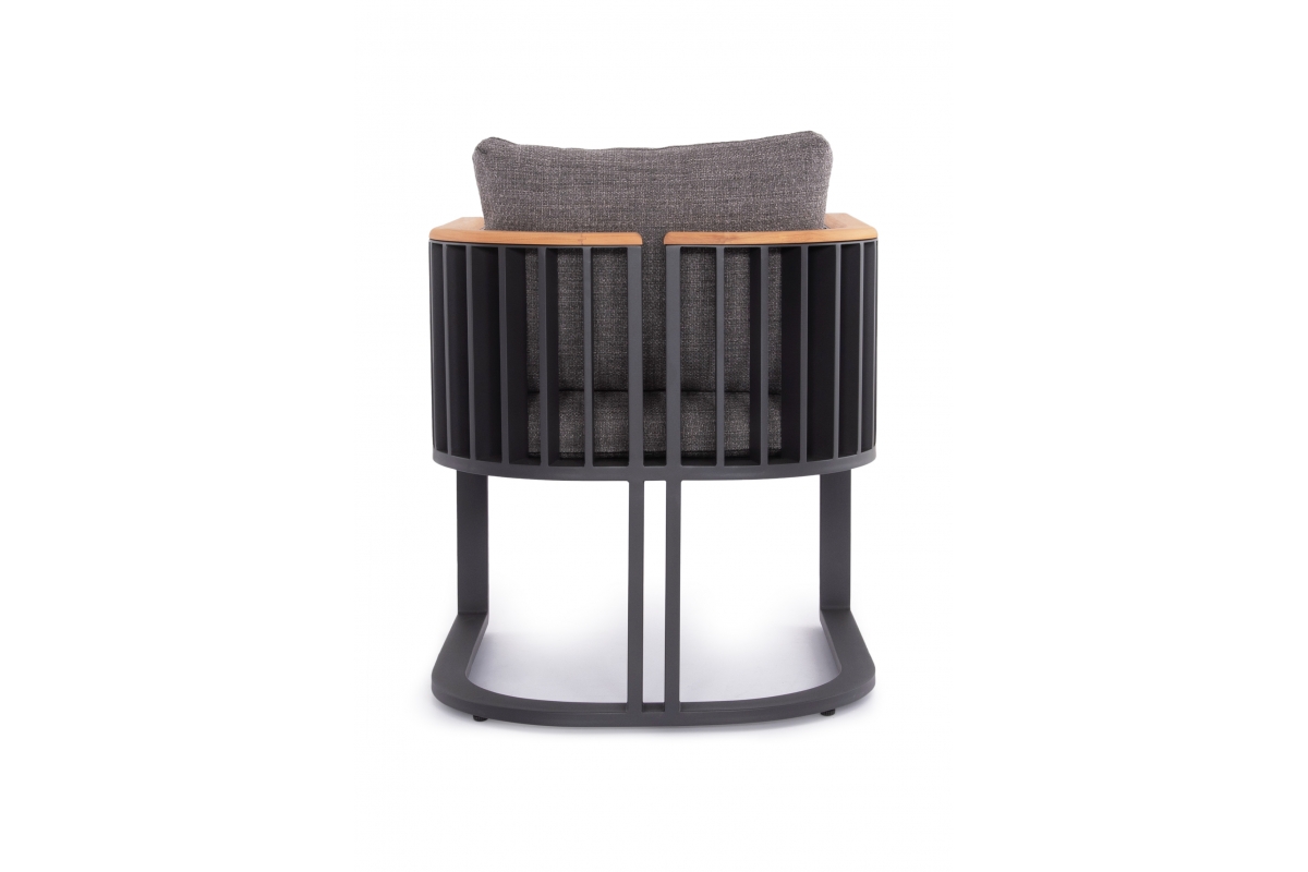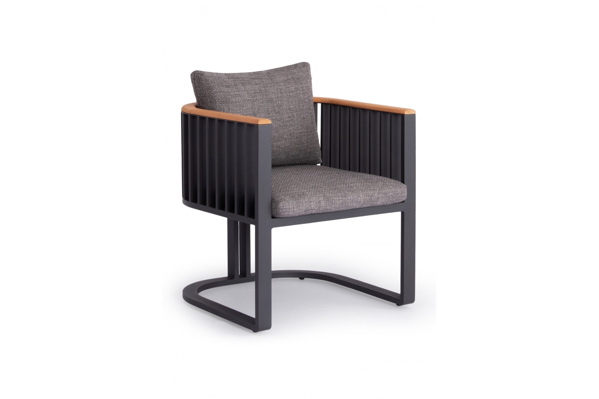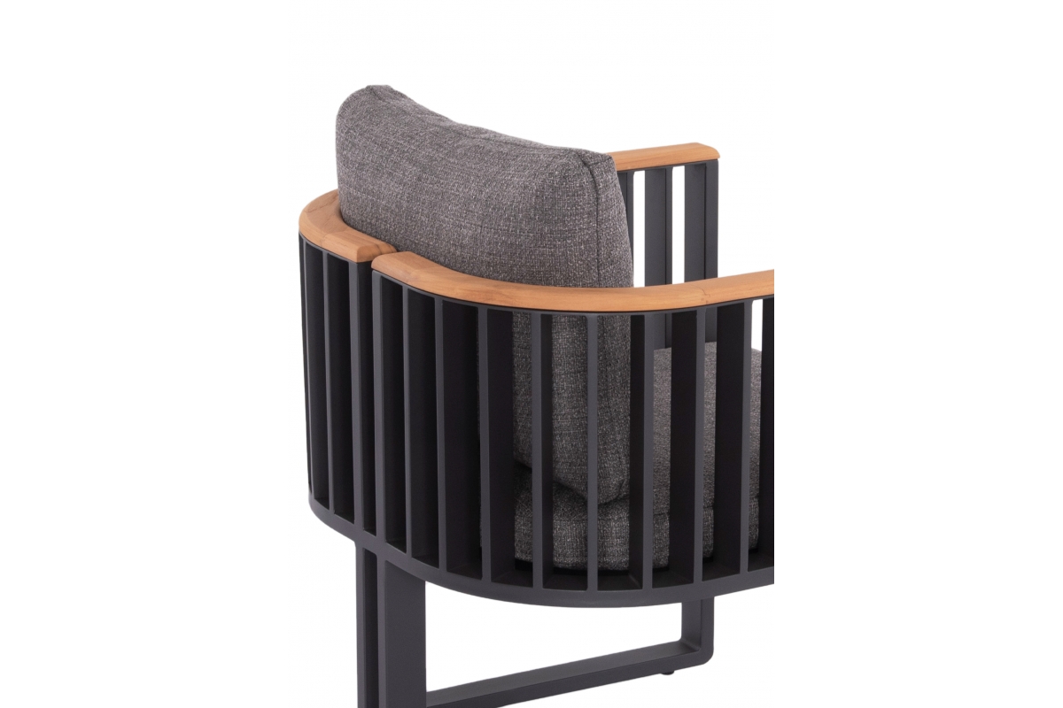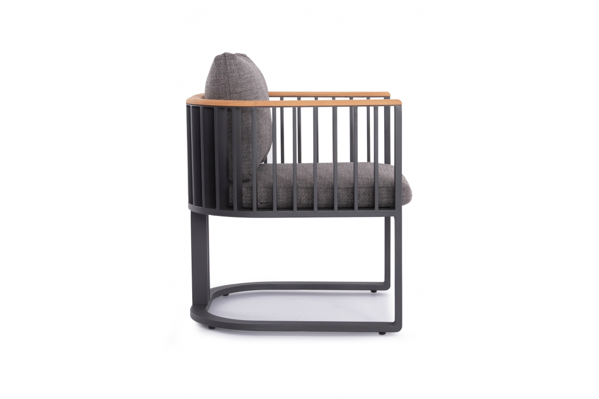 Ο σκελετός είναι από αλουμίνιο σε ΑΝΘΡΑΚΙ χρώμα και τα μαξιλάρια είναι σε χρώμα ΑΝΟΙΧΤΟ ΓΚΡΙ. Η επένδυση στα μπράτσα με ξύλο teak είναι άλλη μία πινελιά πολυτέλειας σε αυτή την μοναδική πολυθρόνα, η οποία ξεχωρίζει και για τον όμορφο σχεδιασμό της βάσης της.