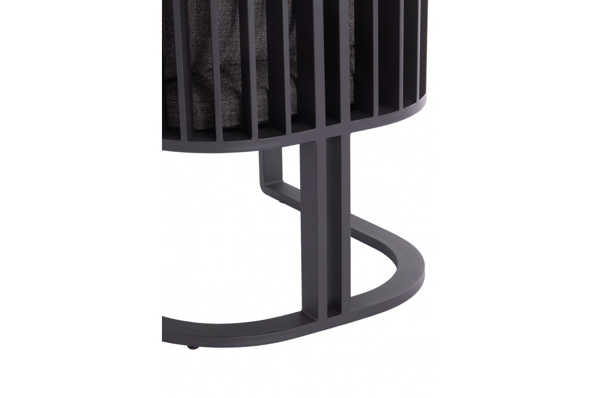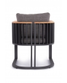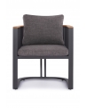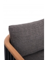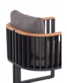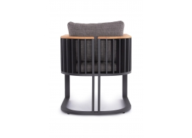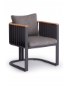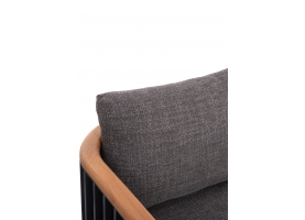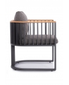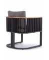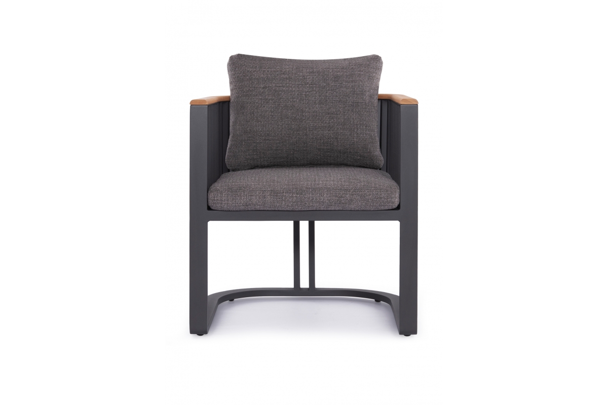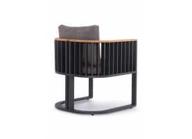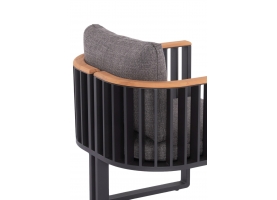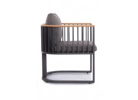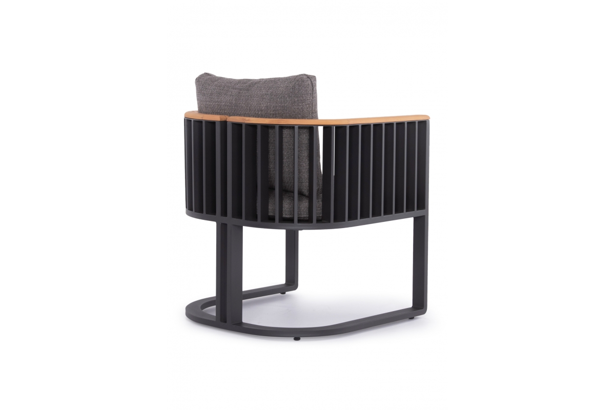 Ο σκελετός είναι από αλουμίνιο σε ΑΝΘΡΑΚΙ χρώμα και τα μαξιλάρια είναι σε χρώμα ΑΝΟΙΧΤΟ ΓΚΡΙ. Η επένδυση στα μπράτσα με ξύλο teak είναι άλλη μία πινελιά πολυτέλειας σε αυτή την μοναδική πολυθρόνα, η οποία ξεχωρίζει και για τον όμορφο σχεδιασμό της βάσης της.