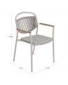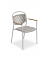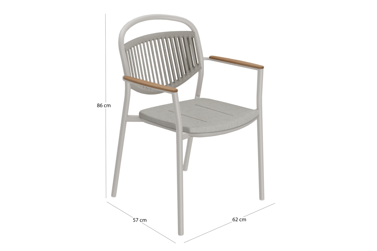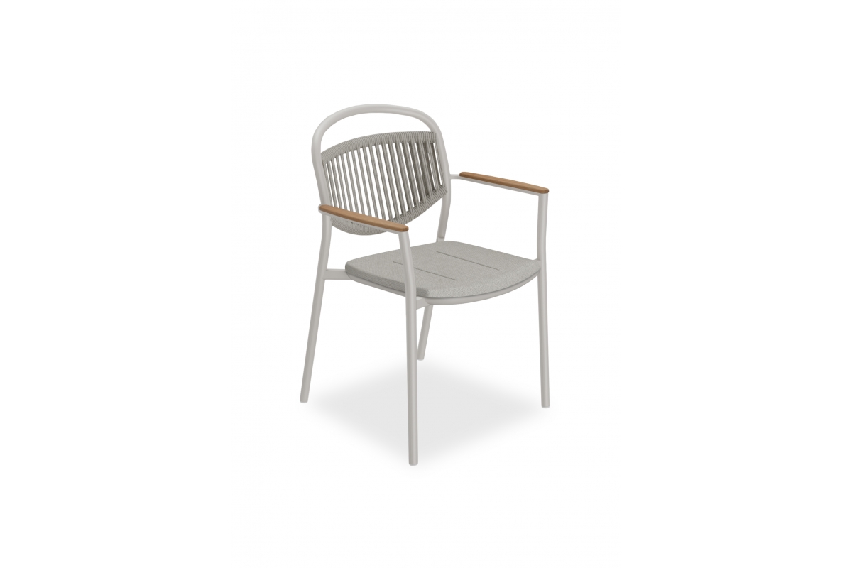 Το κάθισμα διαθέτει μαξιλάρι επενδυμένο με ύφασμα OLEFIN, επίσης σε ΜΠΕΖ χρώμα. Η πινελιά με το ξύλο teak που «ντύνει» τα μπράτσα προσδίδει στην καρέκλα επιπλέον κύρος αλλά και ομορφιά.