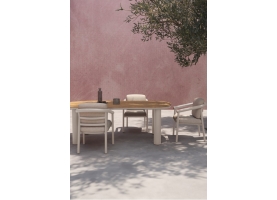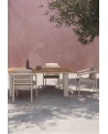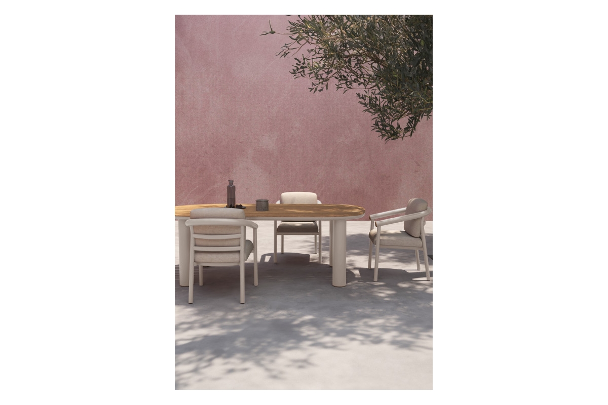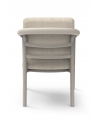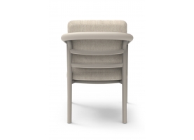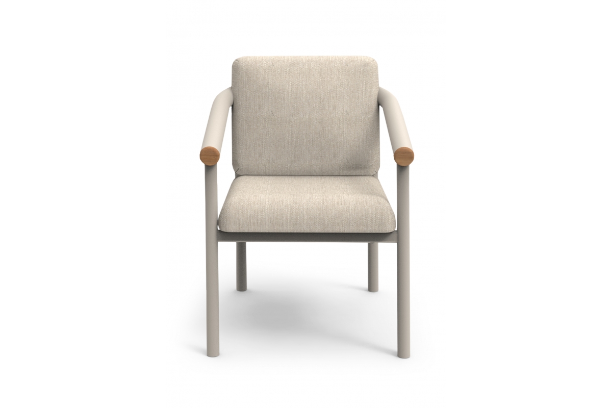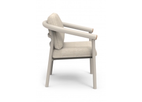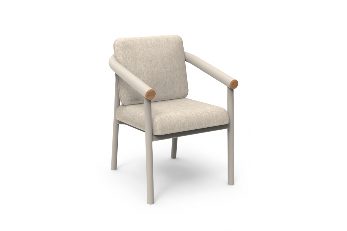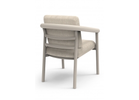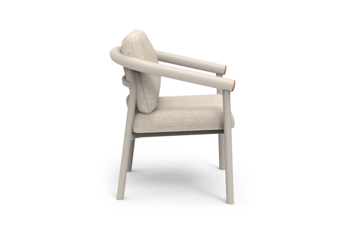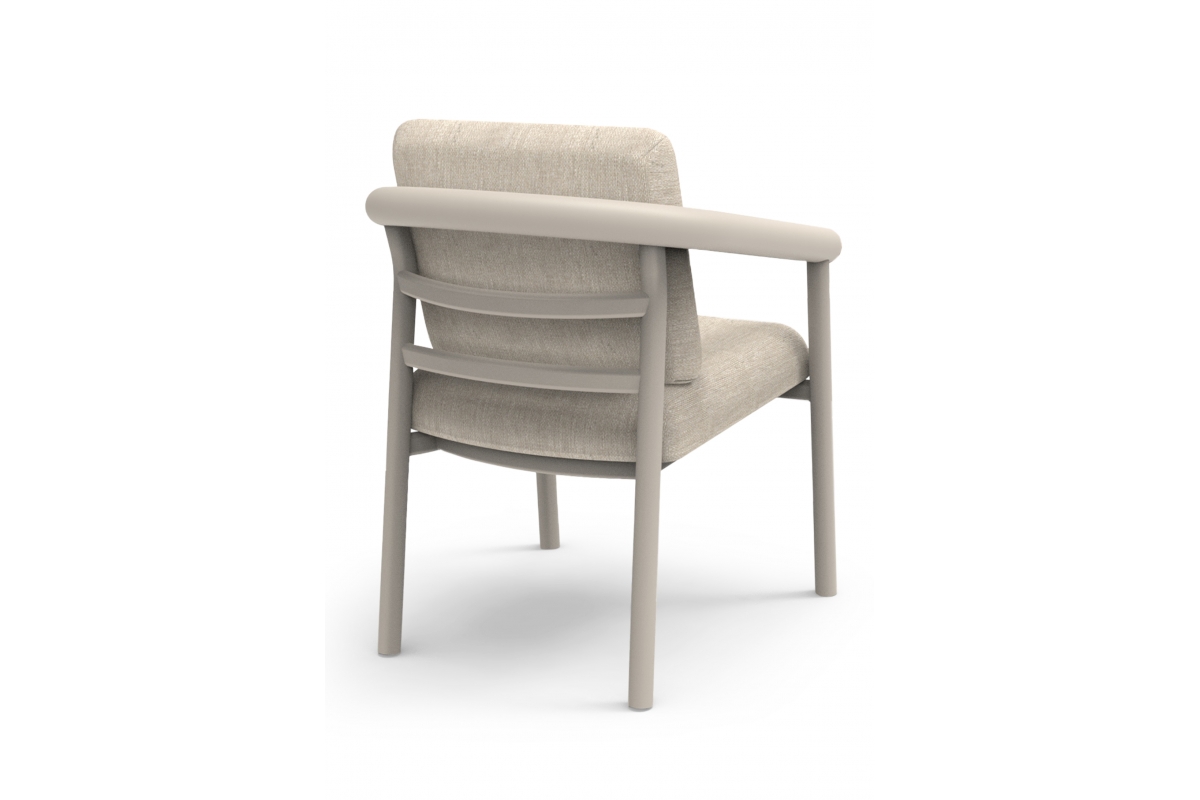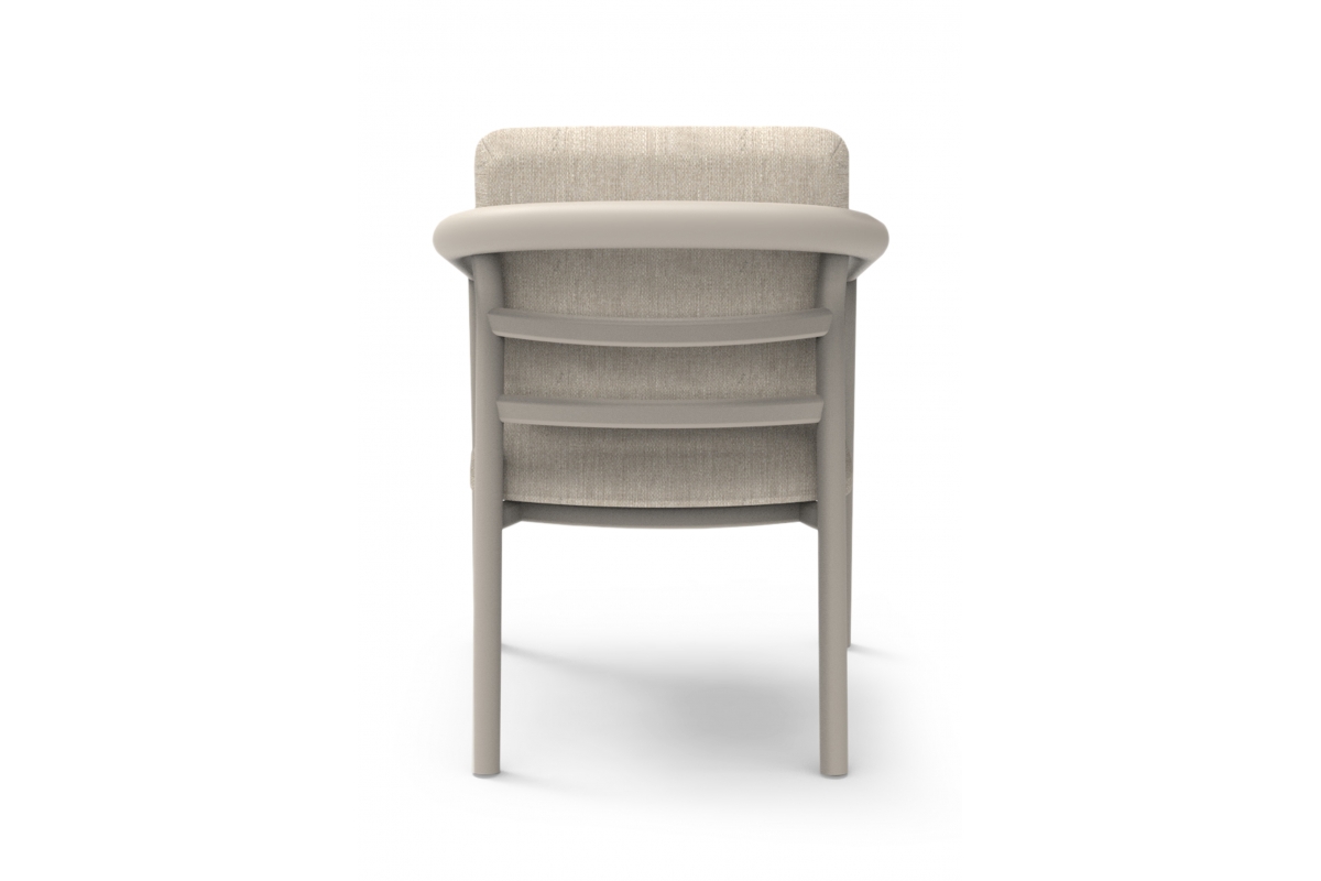 Η πολυθρόνα τραπεζαρίας αλουμινίου της σειράς NOVEL σε ΚΡΕΜ χρώμα έχει ημικυκλική πλάτη και διαθέτει μαξιλάρια πλάτης και καθίσματος επενδυμένα με ύφασμα OLEFIN, σε ΜΠΕΖ χρώμα.