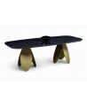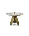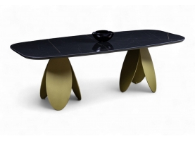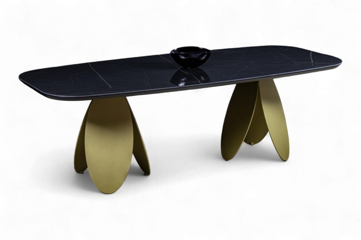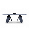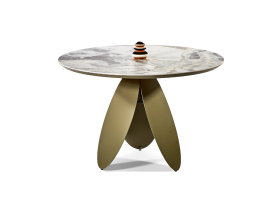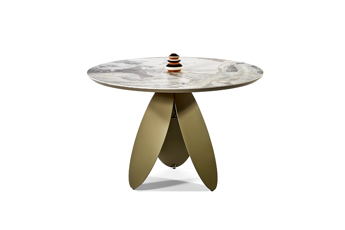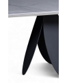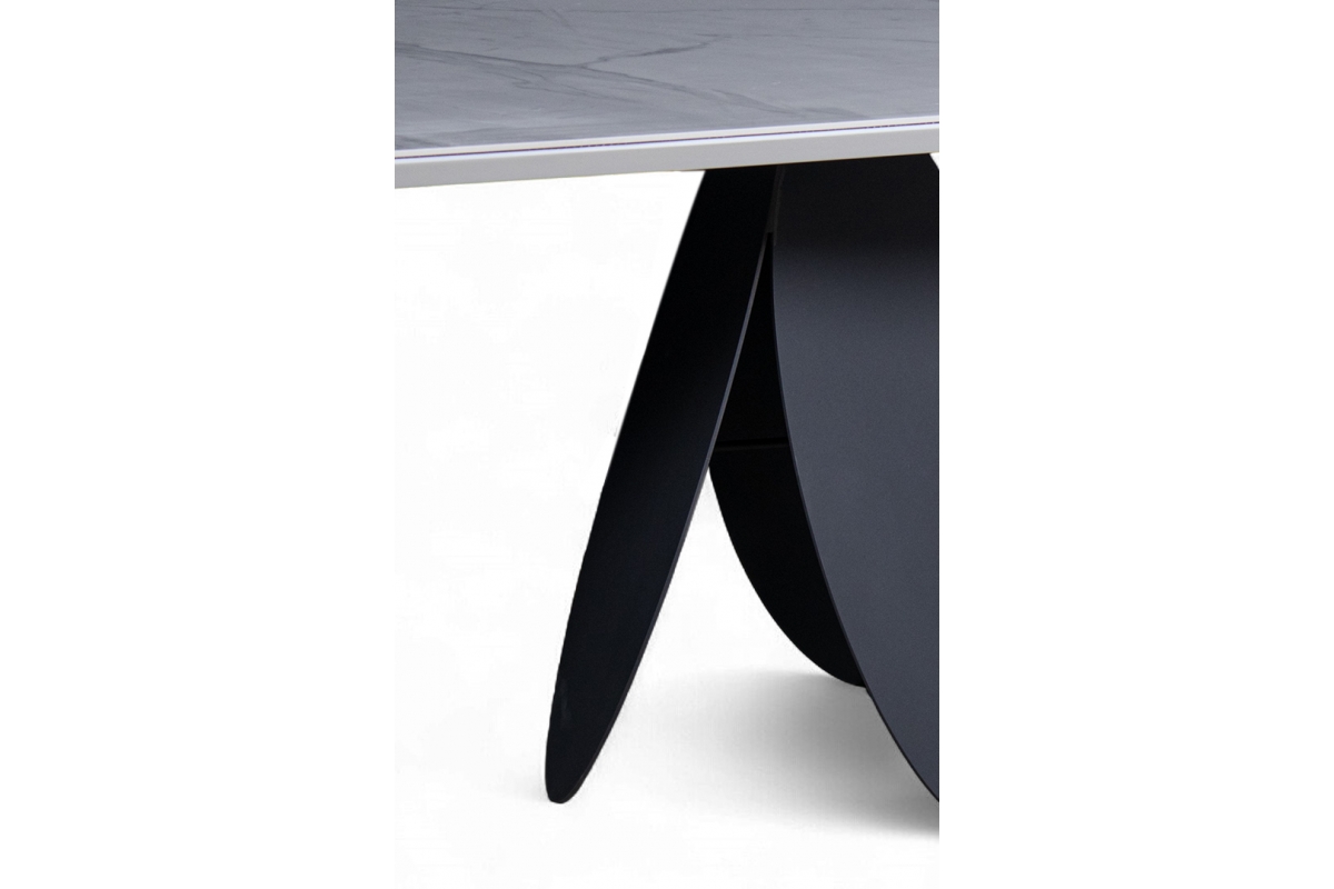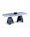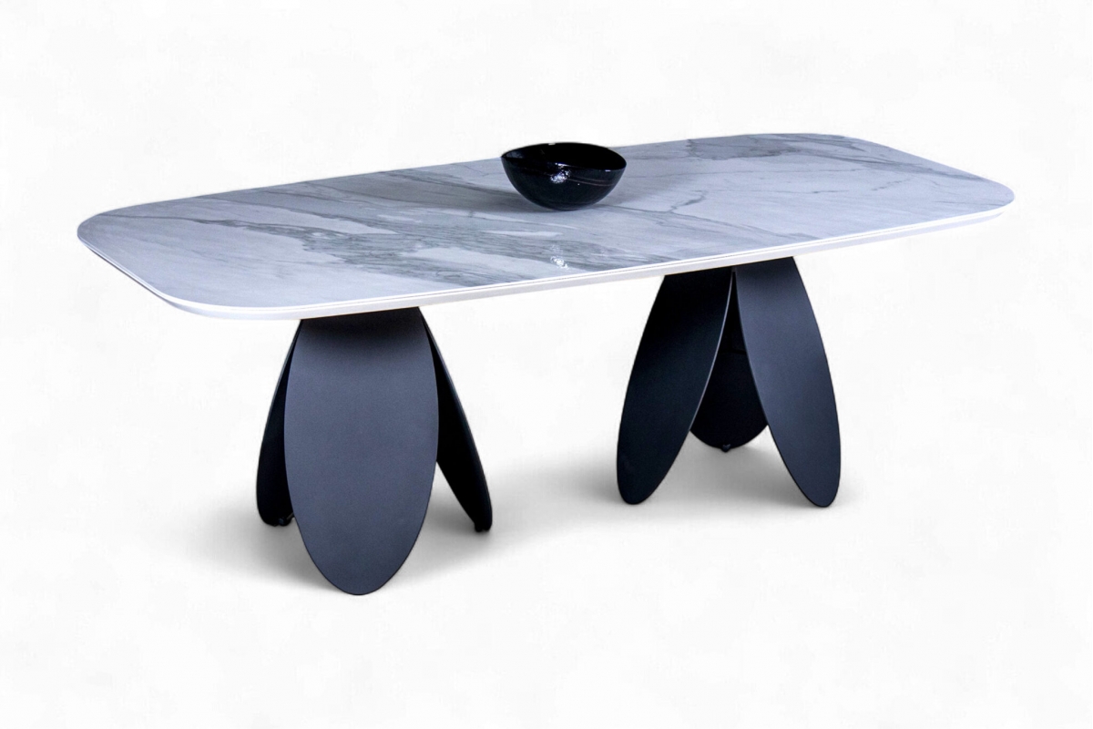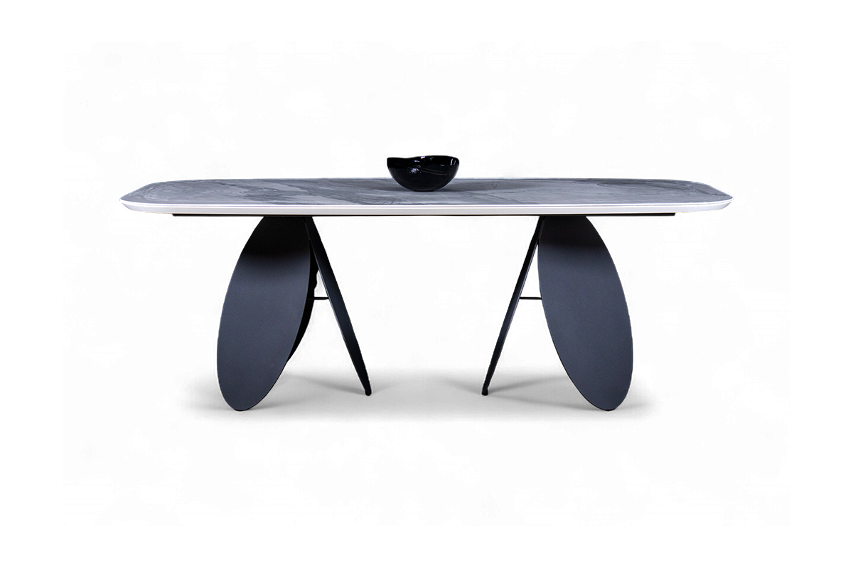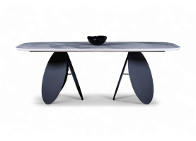 Μία τραπεζαρία που είναι ταυτόχρονα και ένα ιδιαίτερο, διακοσμητικό κομμάτι για το σύγχρονο σπίτι. Το τραπέζι έχει μία μεταλλική βάση ιδιαίτερου σχεδιασμού, με δύο πόδια στήριξης που αποτελούνται από τρία οβάλ κομμάτια. Διαθέτει κεραμική επιφάνεια με σχέδιο μαρμάρου.