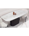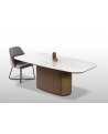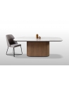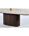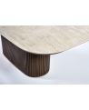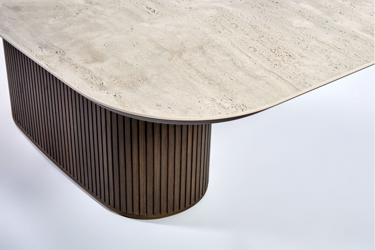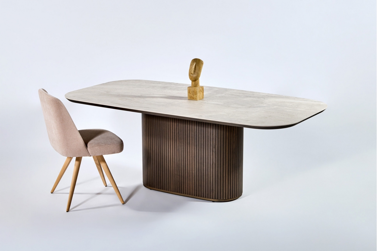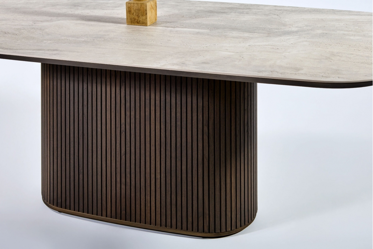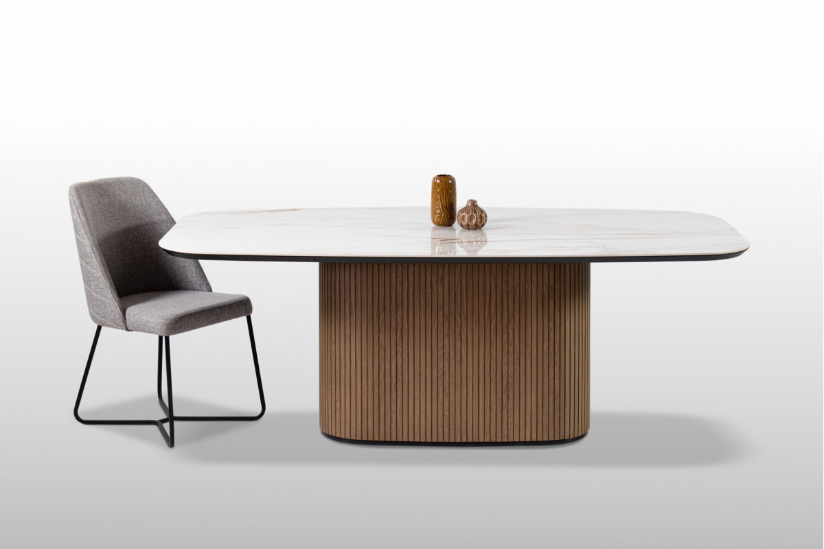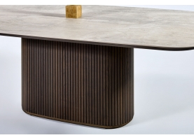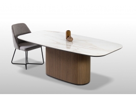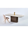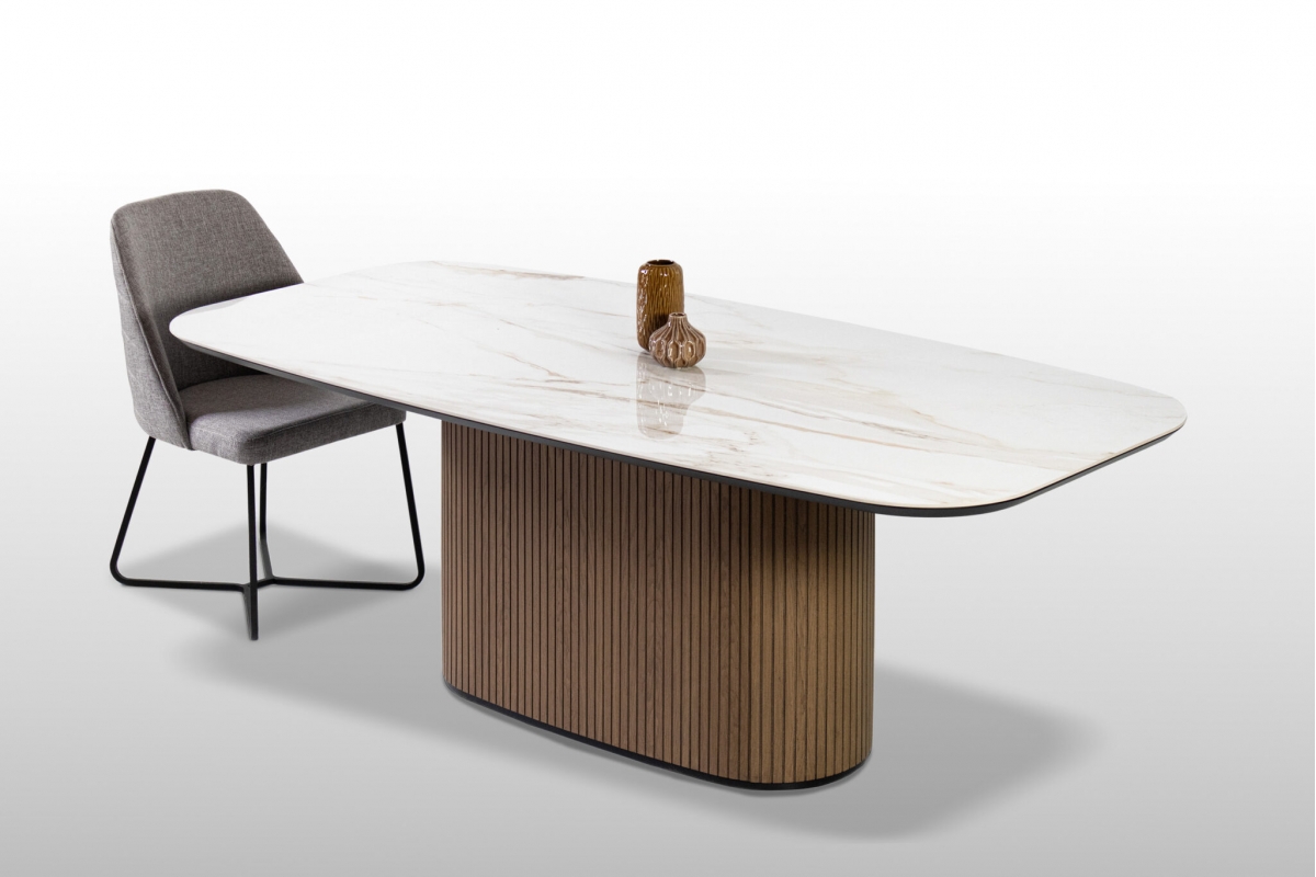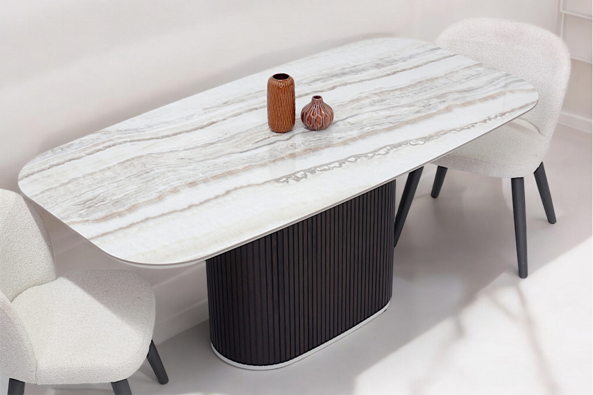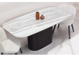 Φτιαγμένο με σχολαστική προσοχή στη λεπτομέρεια, αυτή η μοναδική τραπεζαρία συνδυάζει τη φυσική ομορφιά και την αισθητική γοητεία. Η ξύλινη, οβάλ βάση, διακοσμημένη μεγεωμετρικές λεπτομέρειες, αποπνέει ζεστασιά και προσφέρει έναν νατουριαλιστικό αέρα στον χώρο ενώ το κεραμικό καπάκι με λεπτομέρειες μαρμάρου προσθέτει μια πολυτελή πινελιά με την λεία και γυαλιστερή επιφάνειά του.