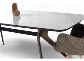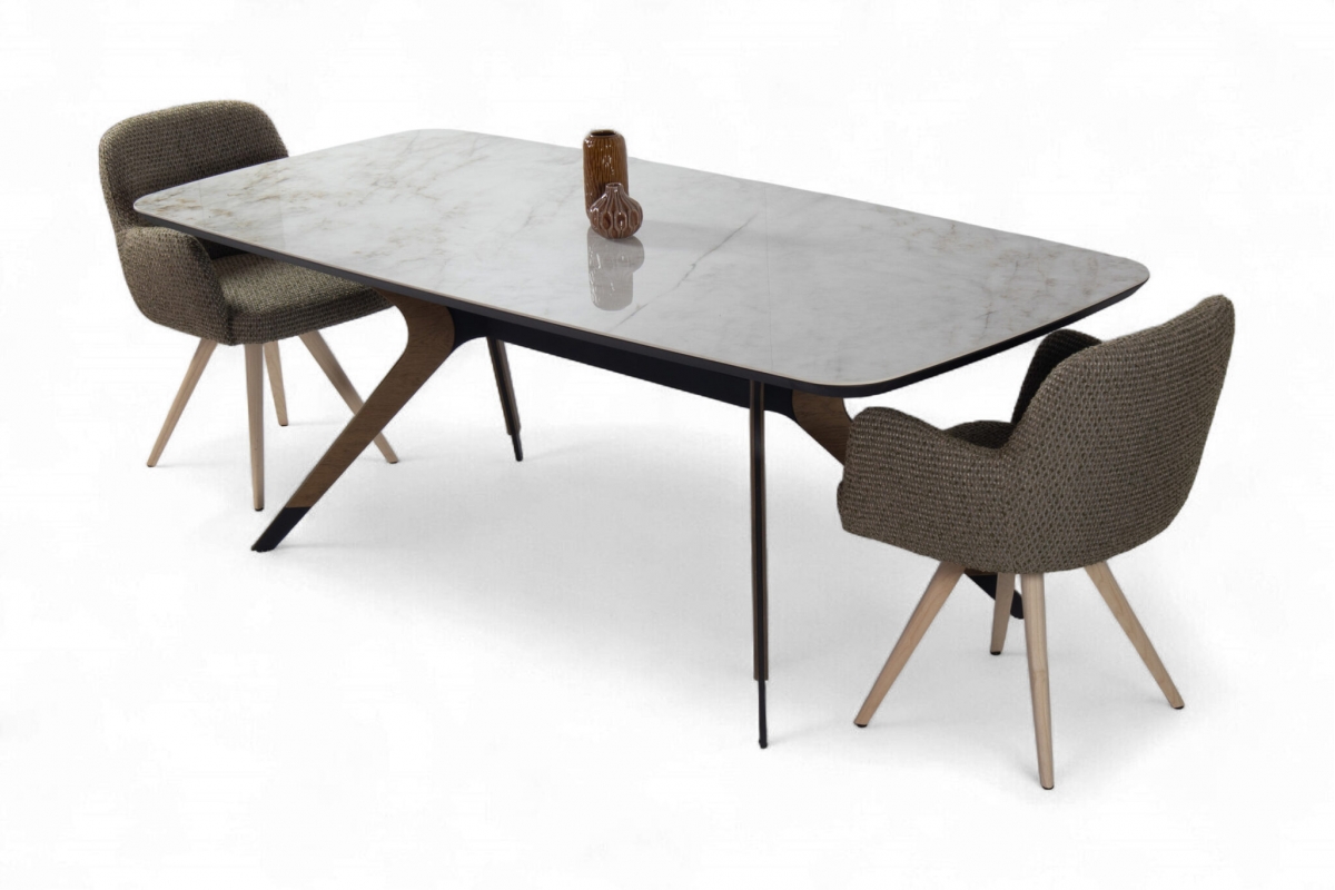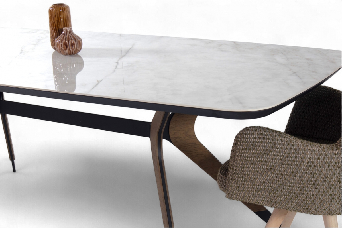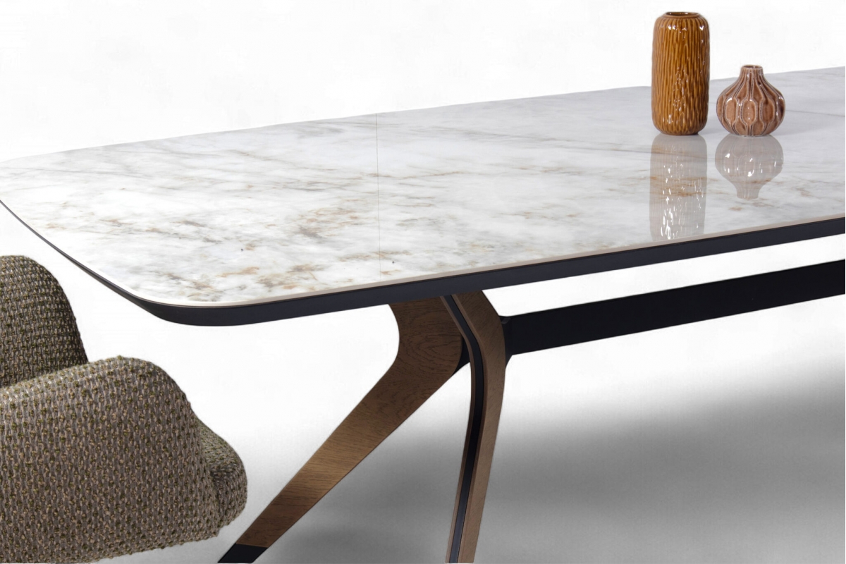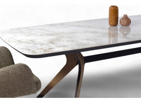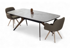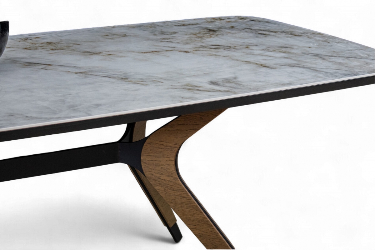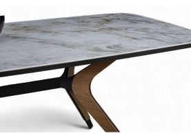 Μία τραπεζαρία που συνδυάζει το μέταλλο και το ξύλο σε ένα έπιπλο με ιδιαίτερο σχεδιασμό στη βάση με μεταλλικές λεπτομέρειες που προσφέρει μία διακριτική πινελιά μοντέρνας διακόσμησης. Η τραπεζαρία διαθέτει ανθεκτική, κεραμική επιφάνεια με σχέδιο μάρμαρου που θα τραβήξει τα βλέμματα.